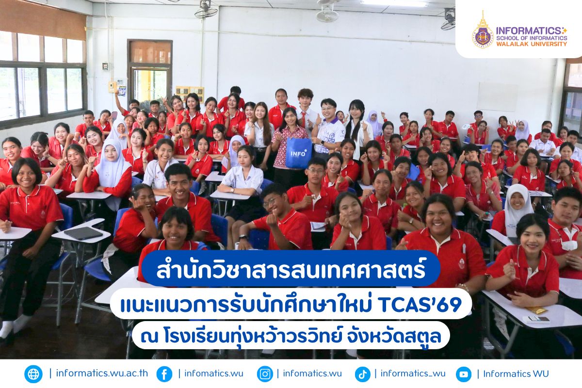 เมื่อวันพุธที่ 5 สิงหาคม 2568 สำนักวิชาสารสนเทศศาสตร์ มหาวิทยาลัยวลัยลักษณ์ ได้จัดกิจกรรมแนะแนวการศึกษาต่อในระบบ TCAS’69 ณ โรงเรียนทุ่งหว้าวรวิทย์ จังหวัดสตูล โดยมีทีมงานประกอบด้วยนักวิชาการ ฝ่ายประชาสัมพันธ์ และงานรับนักศึกษา พร้อมด้วยตัวแทนนักศึกษาจากสำนักวิชา เดินทางไปร่วมให้ข้อมูลและสร้างแรงบันดาลใจแก่นักเรียนในพื้นที่