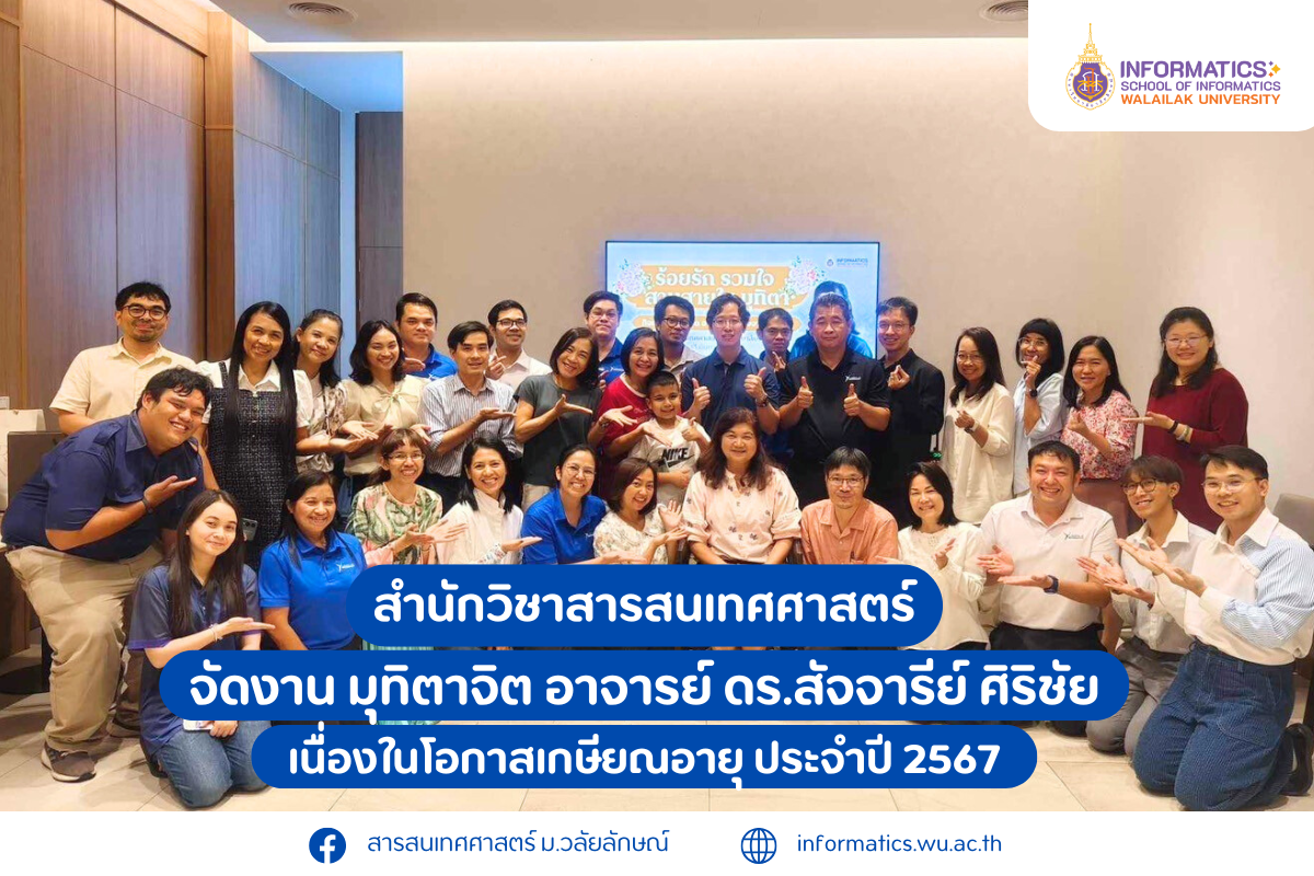 ร้อยรัก รวมใจ สานสายใย มุทิตา เมื่อวันที่ 13 กันยายนที่ผ่านมา สำนักวิชาสารสนเทศศาสตร์ มหาวิทยาลัยวลัยลักษณ์ ได้จัดกิจกรรมมุทิตาจิต อาจารย์ ดร.สัจจารีย์ ศิริชัย เนื่องในโอกาสเกษียณอายุ ประจำปี 2567 บรรยากาศภายในงานเต็มไปด้วยความอบอุ่นและความเป็นกันเอง มีการเปิดภาพถ่ายและคลิปวิดีโอที่สะท้อนความทรงจำดีๆ ในอดีต ซึ่งทำให้หลายคนหัวเราะไปพร้อมกับน้ำตาคลอด้วยความคิดถึงและความซาบซึ้ง ต่อจากนั้น ก็มีการแสดงคลิปแสดงความรู้สึกที่ส่งผ่านความรักและความเคารพต่อท่านอาจารย์อย่างล้นหลาม