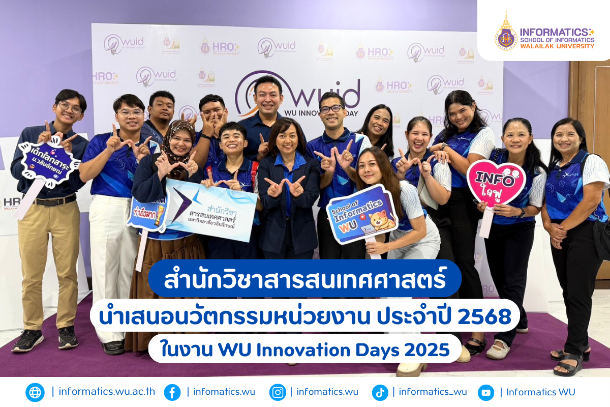 สำนักวิชาสารสนเทศศาสตร์ มหาวิทยาลัยวลัยลักษณ์ ได้เข้าร่วมนำเสนอนวัตกรรมสร้างสรรค์ในงาน WU INNOVATION DAY 2025 (WUID) เมื่อวันจันทร์ที่ 25 สิงหาคม 2568 ณ ห้องประชุมหัวตะพาน ชั้น 3 อาคารจุฬาภรณ์เวชวัฒน์ (อาคาร A) ศูนย์การแพทย์มหาวิทยาลัยวลัยลักษณ์ ผลงานที่นำเสนอคือ “ระบบบริหารงบกองทุนและงบประมาณสารสนเทศศาสตร์ (Informatics Fund and Budget Management System)” ซึ่งถูกพัฒนาขึ้นเพื่อแก้ไขปัญหาด้านการติดตามและรายงานงบประมาณที่ล่าช้า...