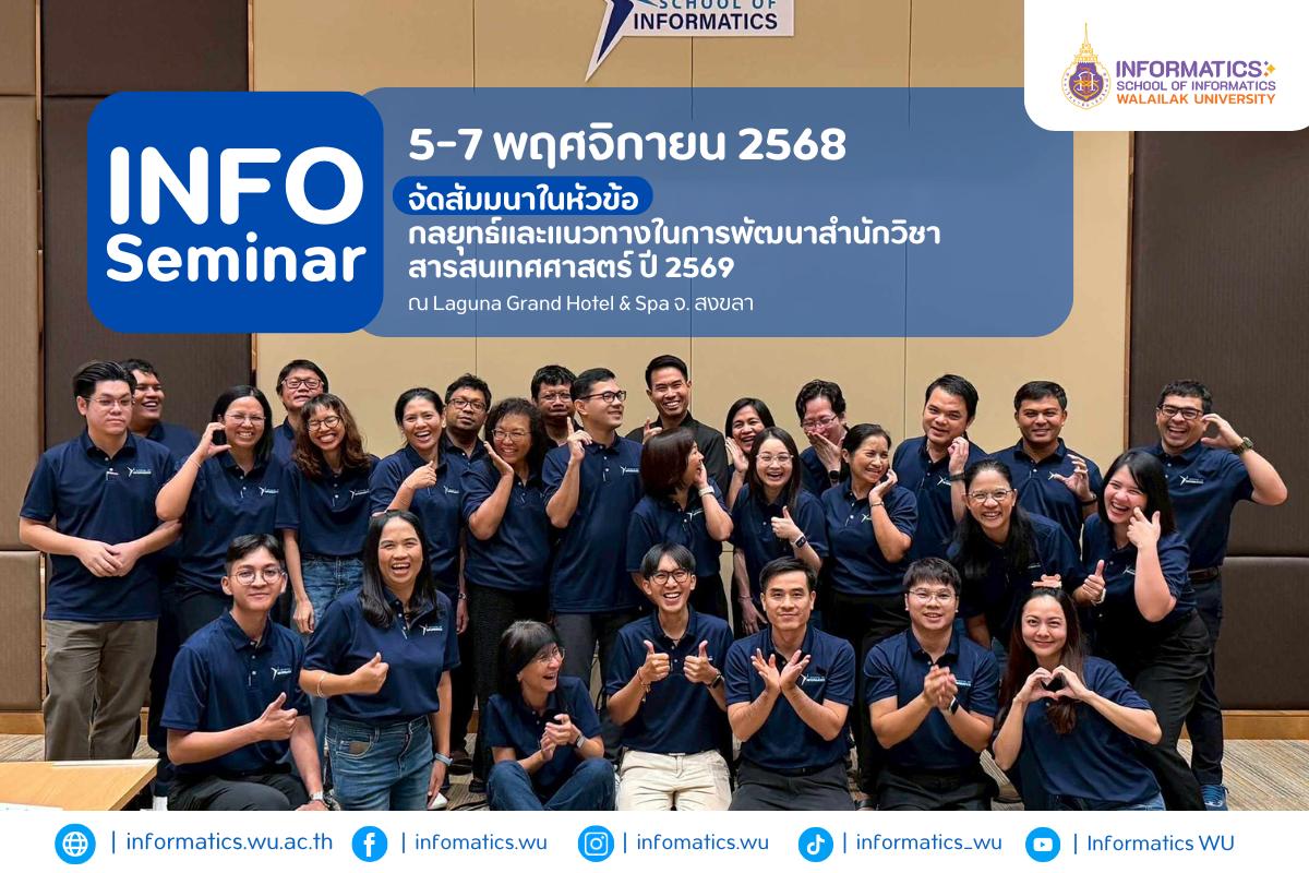 สำนักวิชาสารสนเทศศาสตร์ มหาวิทยาลัยวลัยลักษณ์ จัดกิจกรรมสัมมนาเรื่อง “กลยุทธ์และแนวทางในการพัฒนาสำนักวิชาสารสนเทศศาสตร์ ปี 2569” ระหว่างวันที่ 5–7 พฤศจิกายน 2568 ณ Laguna Grand Hotel & Spa จังหวัดสงขลา โดยมีคณบดี รองคณบดี คณาจารย์ และบุคลากรของสำนักวิชาเข้าร่วมกิจกรรมอย่างพร้อมเพรียง