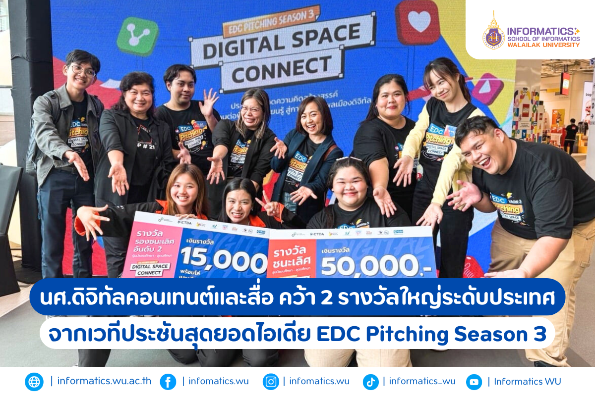 เมื่อวันที่ 19 สิงหาคม 2568 ที่ผ่านมา นักศึกษาชั้นปีที่ 2 หลักสูตรดิจิทัลคอนเทนต์และสื่อ สำนักวิชาสารสนเทศศาสตร์ มหาวิทยาลัยวลัยลักษณ์ ผ่านเข้ารอบการแข่งขัน เวทีประชันสุดยอดไอเดีย EDC Pitching Season 3 ภายใต้ธีม Digital Space Connect เชื่อมต่อพื้นที่การเรียนรู้สู่การพัฒนาพลเมืองดิจิทัล รอบชิงชนะเลิศ จัดโดย สำนักงานพัฒนาธุรกรรมทางอิเล็กทรอนิกส์ (สพธอ.) หรือ ETDA (เอ็ตด้า) กระทรวงดิจิทัลเพื่อเศรษฐกิจและสังคม ณ SCBX NEXT TECH ชั้น 4 สยามพารากอน กรุงเทพมหานคร