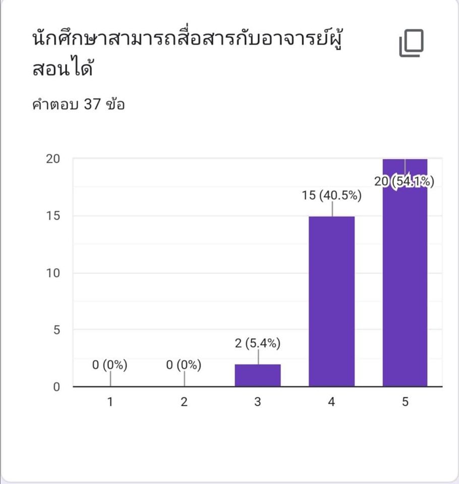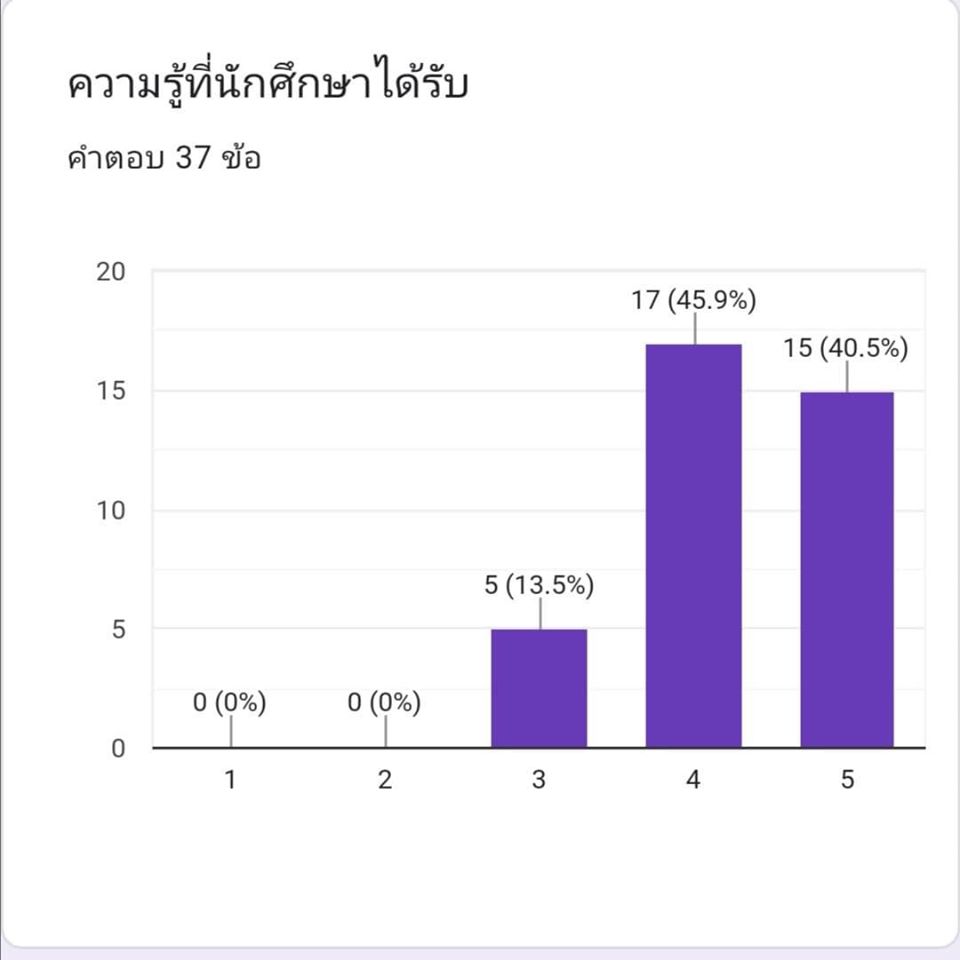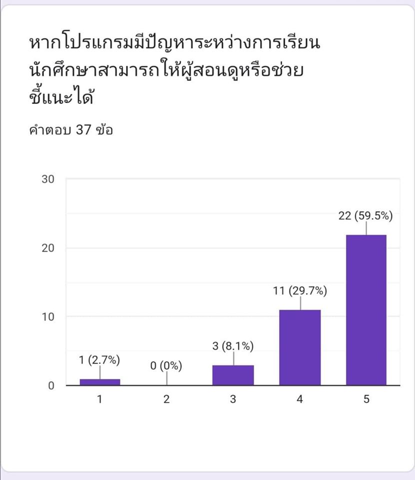 – ระหว่างการสอน มีนักศึษา 1 คนต้องการคนช่วยเหลือโดยตรงหรือชี้แนะ แต่โดยส่วนใหญ่ 88% สามารถจัดการหรือแก้ปัญหาหน้างาน รวมถึงติดต่ออาจารย์ผู้สอนได้