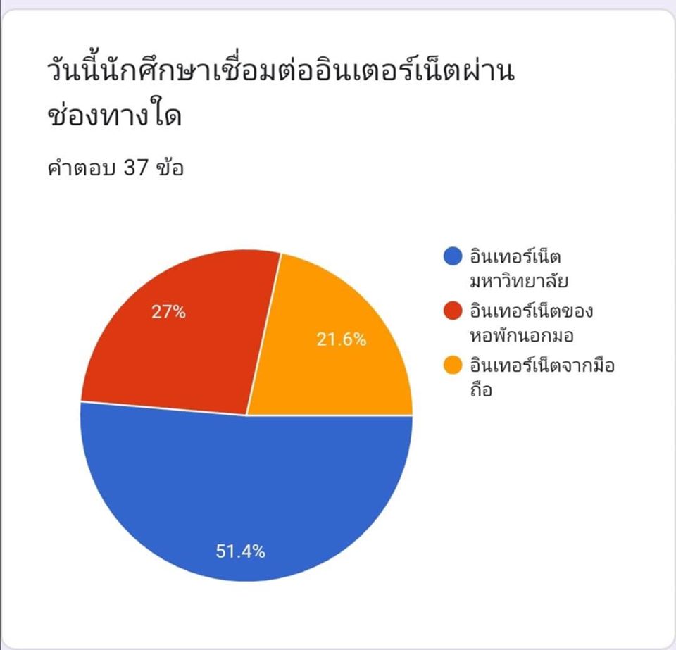 – นศ 51% ใช้อินเทอร์เน็ตของมหาวิทยาลัย จาก หอพัก IT Coworkingspace และโถงหรือพื้นที่ใต้อาคารเรียนต่างๆ ในมหาวิทยาลัย นอกจากนี้ 27% แล 22% ใช้อินเทอร์เน็ตจากหอพักนอกมหาวิทยาลัย และเครือข่ายมือถือ ตามลำดับ