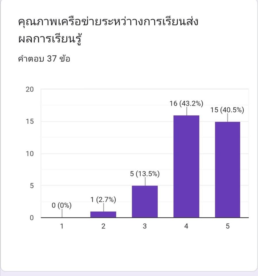 – คุณภาพของเครือข่ายมีผลกระทบต่อการเรียนอยู่ในระดับดีและดีมาก มากกว่า 80% แต่มีนักศึกษา 1 คน ให้ข้อมูลว่า คุณภาพเครือข่ายกระทบต่อการเรียนรู้