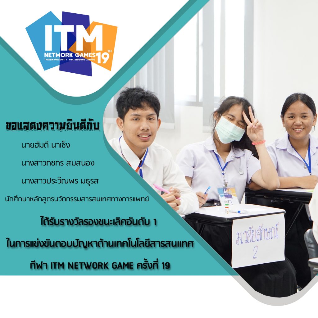 สาขาวิชาเทคโนโลยีสารสนเทศ หลักสูตรนวัตกรรมสารสนเทศทางการแพทย์ ขอแสดงความยินดีกับ นายฮัมดี นาเซ็ง นางสาวกชกร สมสนอง และนางสาวประวีณพร มธุรส นักศึกษาหลักสูตรนวัตกรรมสารสนเทศทางการแพทย์ที่ได้รับรางวัลรองชนะเลิศอันดับ 1 ในการแข่งขันตอบปัญหาด้านเทคโนโลยีสารสนเทศในกิจกรรมกีฬา ITM Network Game ครั้งที่ 19