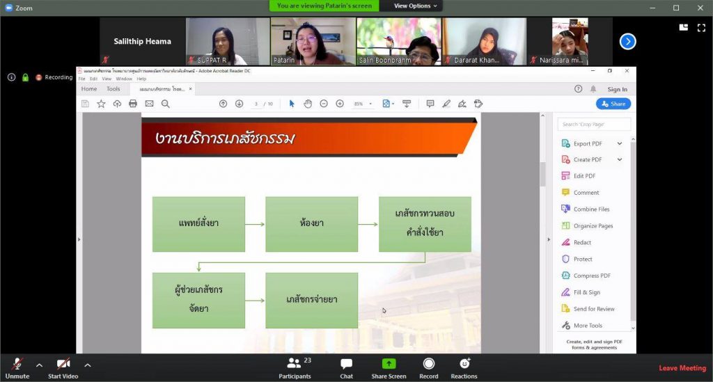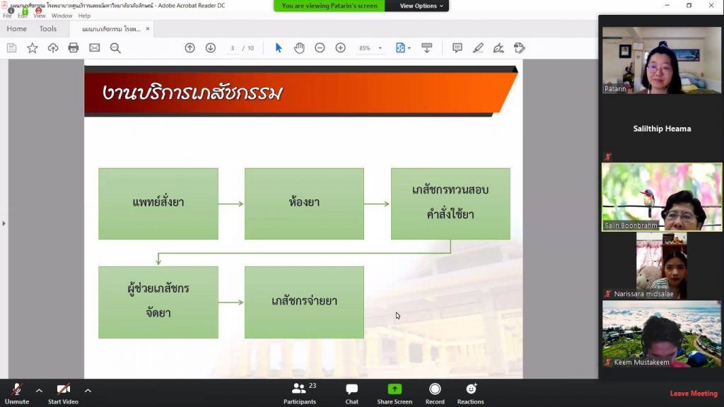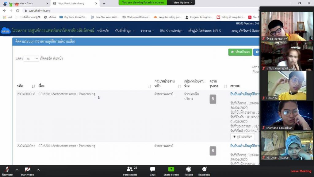 โดยรายวิชา IMI62-151 ประสบการณ์ในสถานพยาบาลเป็นรายวิชาที่ศึกษาการดำเนินงานของสถานพยาบาล รวมทั้งการใช้ระบบสารสนเทศทางการแพทย์โดยเรียนรู้จากสถานการณ์ในสถานที่จริง  แต่เนื่องจากสถานการณ์ Covid-19 ทำให้ไม่สามารถพานักศึกษาไปดูงานยังสถานที่จริง เนื่องจากหลีกเลี่ยงการติดต่อหรือแพร่กระจายของโรค Covid-19 ทางหลักสูตรจึงเชิญเจ้าหน้าที่จากโรงพยาบาลมาเป็นวิทยากรในการสอนบรรยาย คือ คุณภัทรินทร์  อิสระพิทักษ์กุล ตำแหน่งเภสัชกรหญิง โรงพยาบาลศูนย์การแพทย์มหาวิทยาลัยวลัยลักษณ์  ในหัวข้อ “ระบบงานคลังยาและห้องจ่ายยาในโรงพยาบาลศูนย์การแพทย์มหาวิทยาลัยวลัยลักษณ์  ”  โดยสอนออนไลน์ผ่านโปรแกรม Zoom เมื่อวันที่ 1 พฤษภาคม 2563 เวลา 13.00-15.00 น. เพื่อให้นักศึกษาเกิดความเข้าในเรื่องการจัดการยา ระบบคลังยา และการดูแลยา ของโรงพยาบาลเป็นอย่างดีแม้ว่าจะไม่ได้ออกไปดูงานยังสถานที่จริง