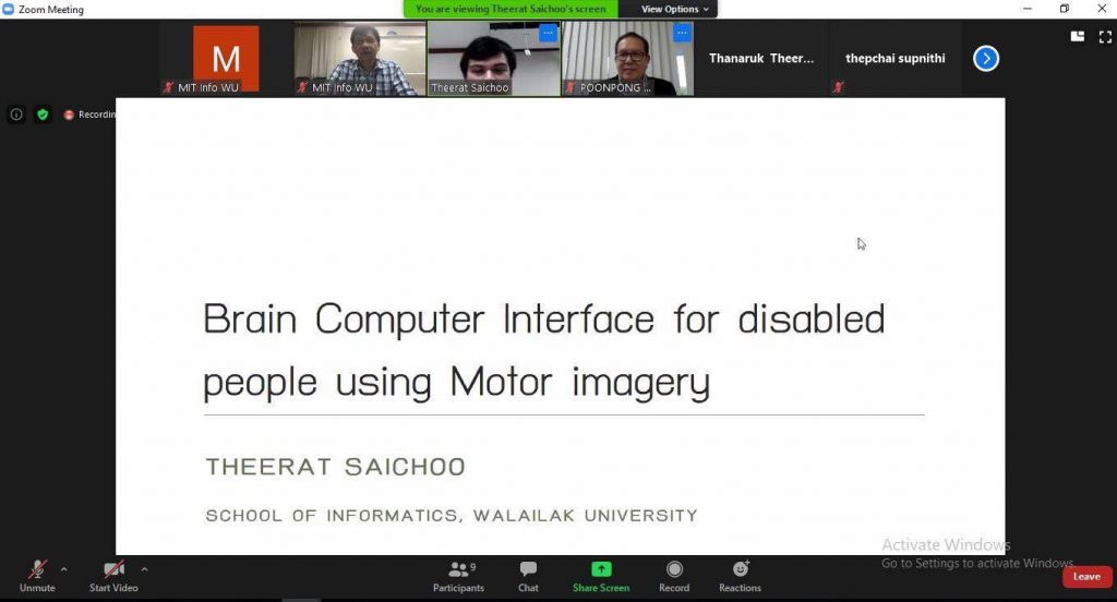 สอบโครงร่างวิทยานิพนธ์ ในหัวข้อ “ Brain Computer Interface for disabled people using Motor imagery ” ซึ่งมีรองศาสตราจารย์ ดร.พูลพงษ์ บุญพราหมณ์ เป็นอาจารย์ที่ปรึกษาวิทยานิพนธ์