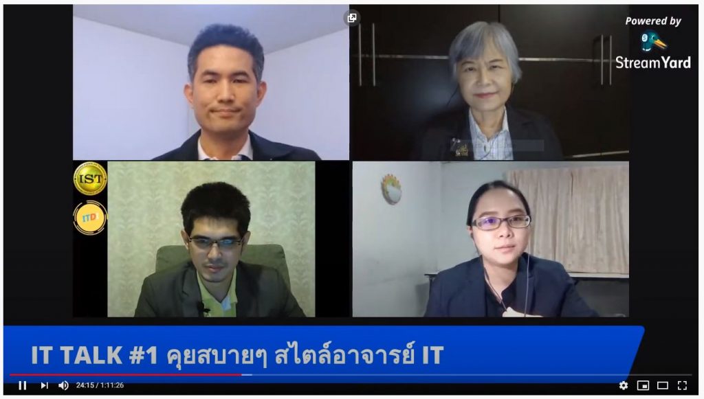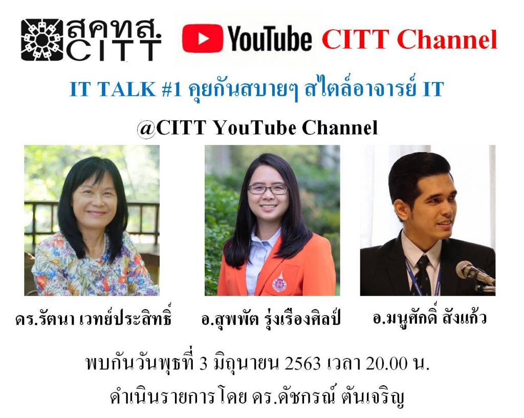 เมื่อวันพุธที่ 3 มิถุนายน 2563 เวลา 20.00 น. ทาง สภาคณบดีคณะเทคโนโลยีสารสนเทศแห่งประเทศไทย CITT ได้ Live สดผ่านทาง Youtube CITT Channel ในหัวข้อ “คุยกันสบายๆ สไตล์อาจารย์ IT” โดยมีอาจารย์ร่วมพูดคุย 3 ท่าน คือ 1) ผศ.ดร.รัตนา เวทย์ประสิทธิ์ (อ.รัตนา) วิทยาลัยการคอมพิวเตอร์ มหาวิทยาลัยสงขลานครินทร์ 2) อาจารย์สุพพัต รุ่งเรืองศิลป์ (อ.เอม) สำนักวิชาสารสนเทศศาสตร์ มหาวิทยาลัยวลัยลักษณ์ และ 3) อาจารย์มนูศักดิ์ สังแก้ว (อ.บ่าว) คณะวิทยาการและเทคโนโลยีสารสนเทศ มหาวิทยาลัยเทคโนโลยีมหานคร ดำเนินรายการโดย ผศ.ดร.ดัชกรณ์ ตันเจริญ (อ.โอ๊ด) สถาบันการจัดการปัญญาภิวัฒน์ (PIM) ใน Live จะมีการพูดคุยเกี่ยวกับ