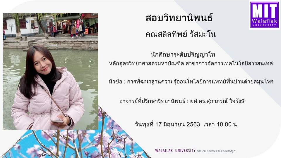 ด้วยหลักสูตรวิทยาศาสตรมหาบัณฑิต สาขาการจัดการเทคโนโลยีสารสนเทศ (MIT) สำนักวิชาสารสนเทศศาสตร์ มหาวิทยาลัยวลัยลักษณ์ จะมีการสอบวิทยานิพนธ์ นักศึกษาระดับปริญญาโท