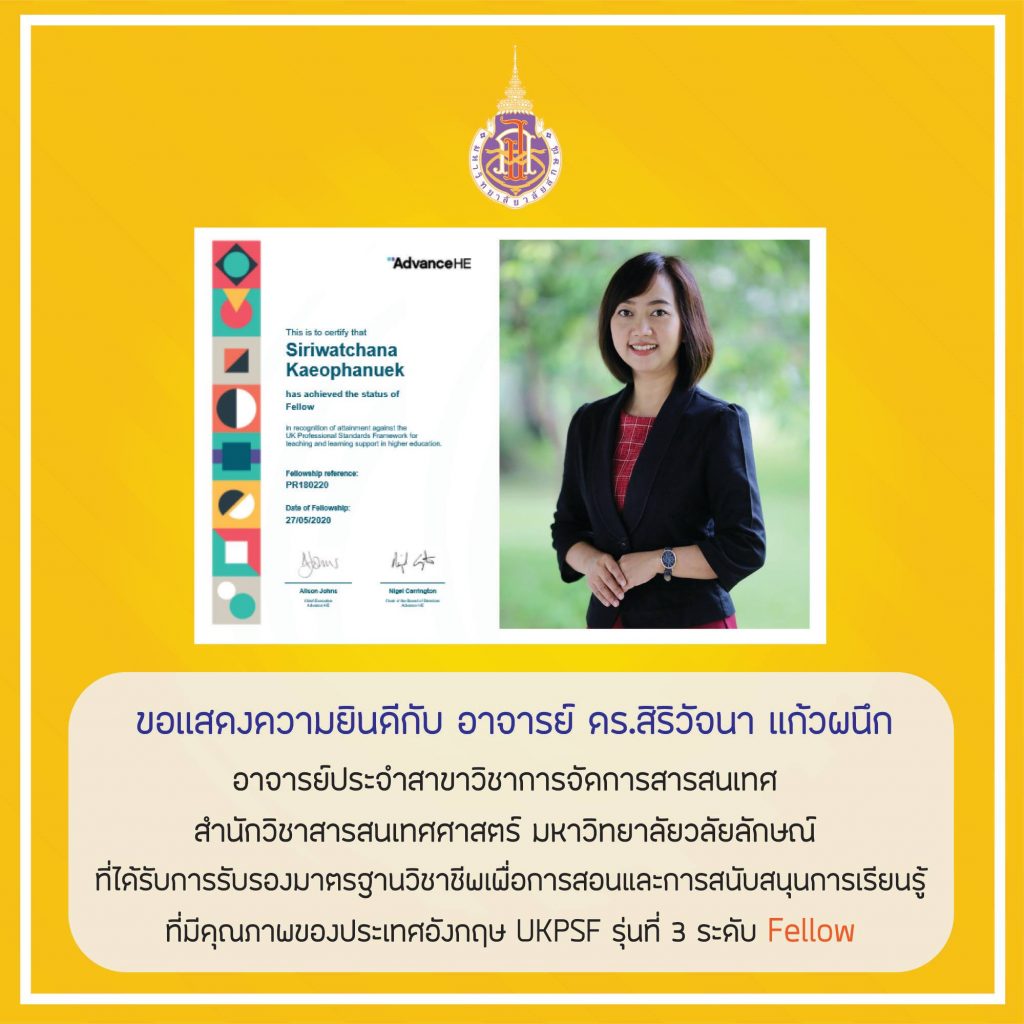 อาจารย์ ดร.สิริวัจนา แก้วผนึก อาจารย์ประจำสาขาวิชาการจัดการสารสนเทศ ได้รับการรับรองมาตรฐานฯ UKPSF รุ่นที่ 3 ระดับ Fellow จากประเทศอังกฤษ