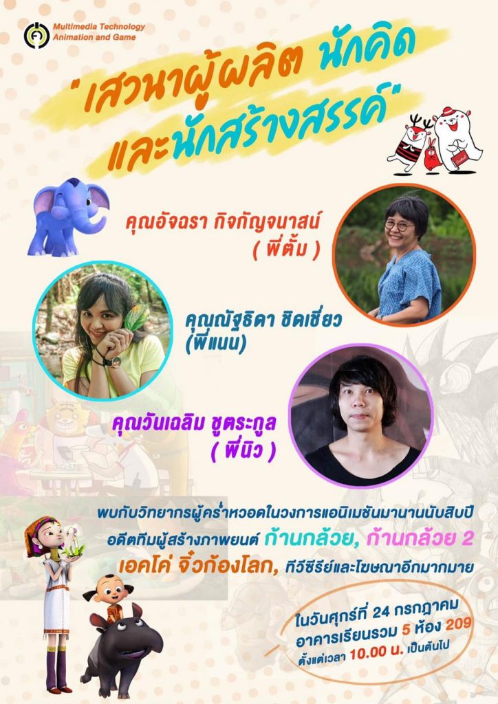 เมื่อวันที่ 24 กรกฎาคม 2563 หลักสูตรเทคโนโลยีมัลติมีเดียและแอนิเมชันได้รับเกียรติ จากคุณอัจฉรา กิจกัญจนาสน์ (พี่ตั้ม) คุณวันเฉลิม ชูตระกูล(พี่นิว) และ คุณณัฐธิดา ชิดเชี่ยว(พี่แนน ศิษย์เก่า MTA รุ่น2) มาบรรยายให้ความรู้เกี่ยวกับการผลิตงานแอนิเมชันและประสบการณ์การทำงานในวงการแอนิเมชัน สำหรับเป็นการสร้างแรงบันดาลใจให้กับนักศึกษาหลักสูตรเทคโนโลยีมัลติมีเดียและแอนิเมชันได้เรียนรู้ประสบการณ์ตรงจากองค์กรวิชาชีพซึ่งมีความชำนาญทางทักษะโดยตรงจึงถือเป็นแนวทางหนึ่งที่จะช่วยพัฒนาศักยภาพของนักศึกษาให้สำเร็จตามความมุ่งหมาย