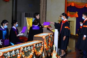 ในการนี้ พระราชทานพระโอวาทแก่ผู้สำเร็จการศึกษา ความว่า “…บัณฑิตทุกคนผู้มีความอุตสาหะพยายาม    จนสำเร็จการศึกษาแล้วในวันนี้ ย่อมมุ่งหวังที่จะนำความรู้ความสามารถ  ไปใช้สร้างความสำเร็จในอาชีพการงาน และสร้างความเจริญของชีวิตในวันข้างหน้าต่อไป แต่ก็เป็นที่ทราบกันดีว่า ปัจจุบันนี้ ประเทศทั้งหลายทั่วโลกได้ประสบปัญหาต่าง ๆ   อย่างรุนแรงและกว้างขวาง  ทั้งในด้านสุขภาพและเศรษฐกิจ  ทุกคนจึงต้องตั้งใจให้หนักแน่นแน่วแน่  และเตรียมตัวให้พร้อม ที่จะนำพาตนเองและชาติบ้านเมืองของเรา ให้ผ่านพ้นอุปสรรคปัญหาทั้งปวง และมีความก้าวหน้ามั่นคงต่อไป  ด้วยการปฏิบัติตนให้เป็นผู้มีสุขภาพร่างกายแข็งแรง  สุขภาพจิตใจเข้มแข็ง เพราะสุขภาพกายและจิตที่ดีนั้น เป็นพื้นฐานสำคัญให้คนเรานำความรู้ความสามารถ ไปใช้ปฏิบัติงานสร้างสรรค์ประโยชน์ได้อย่างเต็มที่ พร้อมทั้งตั้งมั่นอยู่ในคุณธรรมความสุจริต  ดำเนินชีวิตด้วยความไม่ประมาท ถ้าทำได้ดังที่กล่าวมานี้  บัณฑิตก็จะเป็นผู้สามารถสร้างสรรค์ความสำเร็จและความเจริญมั่นคง  ให้แก่ตนเองและชาติบ้านเมืองได้สมดังที่มุ่งหวัง…”