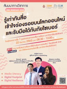 เมื่อวันที่ 22 กันยายน 2563 ที่ผ่านมา สาขาวิชาการจัดการสารสนเทศ โดยหลักสูตรการจัดการสารสนเทศดิจิทัล จัดสัมมนาทางวิชาการ เรื่อง “รู้เท่าทันสื่อเข้าใจร่องรอยบนโลกออนไลน์และรับมือได้กับภัยไซเบอร์” ได้รับเกียรติจาก ผู้ช่วยศาสตราจารย์ ดร.ศิวนาถ นันทพิชัย ผู้อำนวยการศูนย์บรรณสารและสื่อการศึกษา กล่าวต้อนรับและเป็นประธานในการจัดงาน โดยกิจกรรมในครั้งนี้ทางสาขาวิชาการจัดการสารสนเทศร่วมมือกับศูนย์บรรณสารและสื่อการศึกษา จัดขึ้น ณ โถงนิทรรศการ ชั้น 1 ศูนย์บรรณสารเเละสื่อการศึกษา มหาวิทยาลัยวลัยลักษณ์ และได้รับเกียรติจากวิทยากรผู้มากความสามารถ 3 ท่าน ได้แก่ คุณณัฐรัชต์ สาเมาะ ผู้เชี่ยวชาญด้าน Cyberbullying  คุณครูฉัตรชัย ชูแสงนิล ครูต้นแบบการจัดการเรียนรู้บูรณาการทักษะชีวิต ระดับประเทศ ประจำปีการศึกษา 2561 และคุณสวชิรพรรณ ทองวิจิตร นักวิชาการสาขาวิชาเทคโนโลยี สสวท. การจัดสัมมนาในครั้งนี้ มีหัวข้อย่อยของการสัมมนาออกเป็น 3 เรื่องด้วยกัน 1. Media Literacy 2. Digital Footprint 3. Digital Resilience