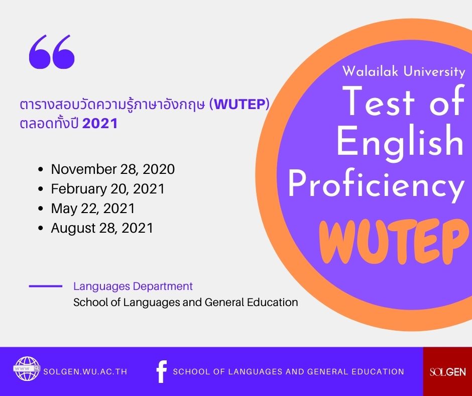 สำนักวิชาพหุภาษาและการศึกษาทั่วไปดำเนินการจัดทำข้อสอบมาตรฐาน WUTEP (Walailak University Test of English Proficiency)  เพื่อให้นักศึกษา บุคลากรของมหาวิทยาลัยวลัยลักษณ์ รวมถึงบุคคลภายนอก ที่มีความประสงค์จะทดสอบความรู้ความสามารถด้านภาษาอังกฤษ ซึ่งทดสอบความรู้ความสามารถด้านภาษาอังกฤษที่ใช้วัดความสามารถ ตั้งแต่ผู้ที่ใช้ภาษาอังกฤษในระดับเริ่มต้น จนถึงผู้ที่ใช้ภาษาอังกฤษได้ในระดับใกล้เคียงกับเจ้าของภาษาอีกด้วย โดยข้อสอบ WUTEP (Walailak University Test of English Proficiency)  ทดสอบทั้งสิ้น 4 ทักษะ ประกอบไปด้วย 1. ทักษะการฟัง (Listening) 2. ทักษะการอ่าน (Reading) 3. ทักษะการเขียน (Writing) และ 4. ทักษะการพูด (Speaking)หากสนใจสมัครเขาร่วมทดสอบ WUTEP (Walailak University Test of English Proficiency)