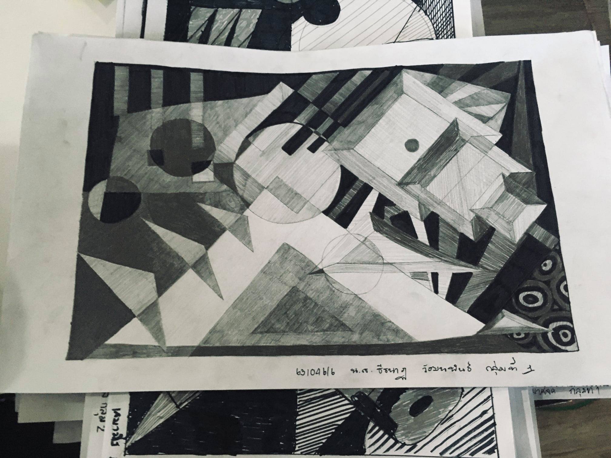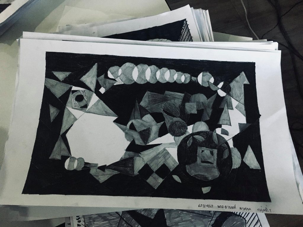 – รูปร่าง รูปทรงเรขาคณิต เป็นรูปร่างที่ประกอบด้วยเส้นตรงและเส้นโค้ง เช่น รูปครึ่งวงกลม รูปวงกลม รูปสามเหลี่ยม รูปสี่เหลี่ยม รูปห้าเหลี่ยม เป็นต้น