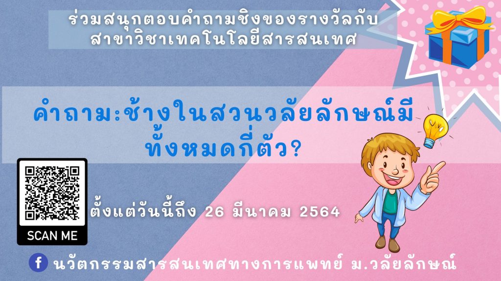 หลักสูตรนวัตกรรมสารสนเทศทางการแพทย์ สำนักวิชาสารสนเทศศาสตร์ มหาวิทยาลัยวลัยลักษณ์ จัดกิจกรรมตอบคำถามแจกของรางวัลให้กับแฟนเพจ facebook ของหลักสูตร ชื่อว่า นวัตกรรมสารสนเทศทางการแพทย์ ม.วลัยลักษณ์ แทนคำขอบคุณสำหรับแฟนเพจทุกท่านที่คอยสนับสนุนเรามาตลอด ทีมงานหลักสูตรนวัตกรรมสารสนเทศทางการแพทย์ จัดรางวัล มาให้แฟนเพจที่น่ารักของเราแบบไม่ยั้ง!