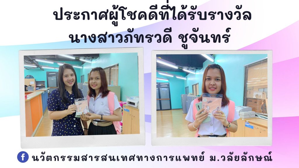 กิจกรรมแจกของรางวัลจะจัดขึ้นอย่างต่อเนื่อง ผู้สนใจร่วมกิจกรรมสามารถเข้ามาในเพจ นวัตกรรมสารสนเทศทางการแพทย์ ม.วลัยลักษณ์ โดยการแสกน QR Code เพื่อเข้ามาตอบคำถามผ่าน Google Form ที่แอดมินเตรียมไว้ให้ หรือคอมเม้นตอบคำถามในโพสต์ที่ทางหลักสูตรจัดกิจกรรมได้เลย เมื่อถึงเวลาแอดมินจะตรวจสอบรายชื่อผู้โชคดีและดำเนินการติดต่อมารับรางวัลหรือหากไม่สะดวกทางแอดมินจะจัดส่งของรางวัลไปยังที่อยู่ที่ให้ไว้