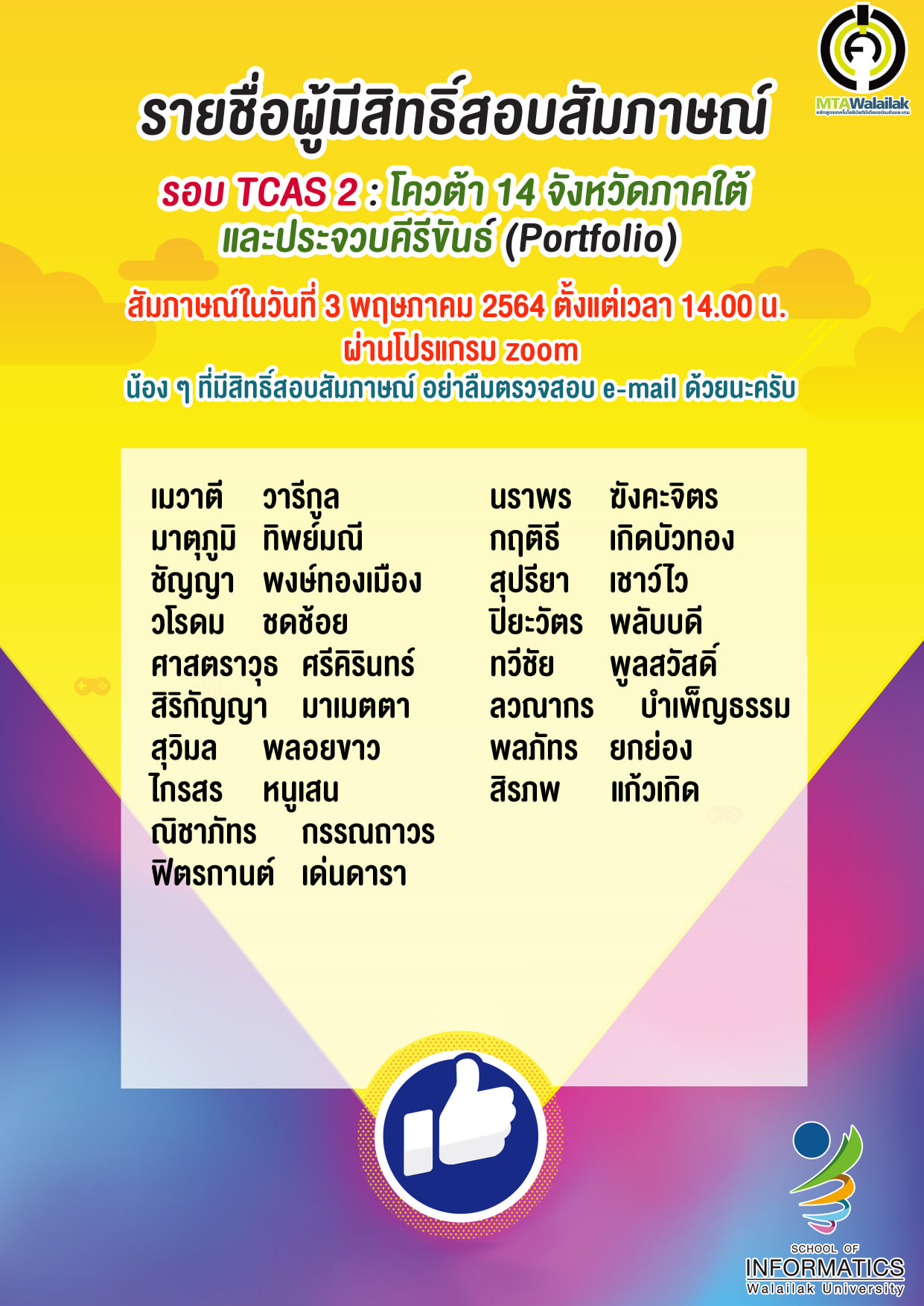 หลักสูตรมัลติมีเดียแอนิเมชัน ม.วลัยลักษณ์ ประกาศรายชื่อน้องๆ ที่มีสิทธิ์ สอบสัมภาษณ์ ” TCAS 2 “