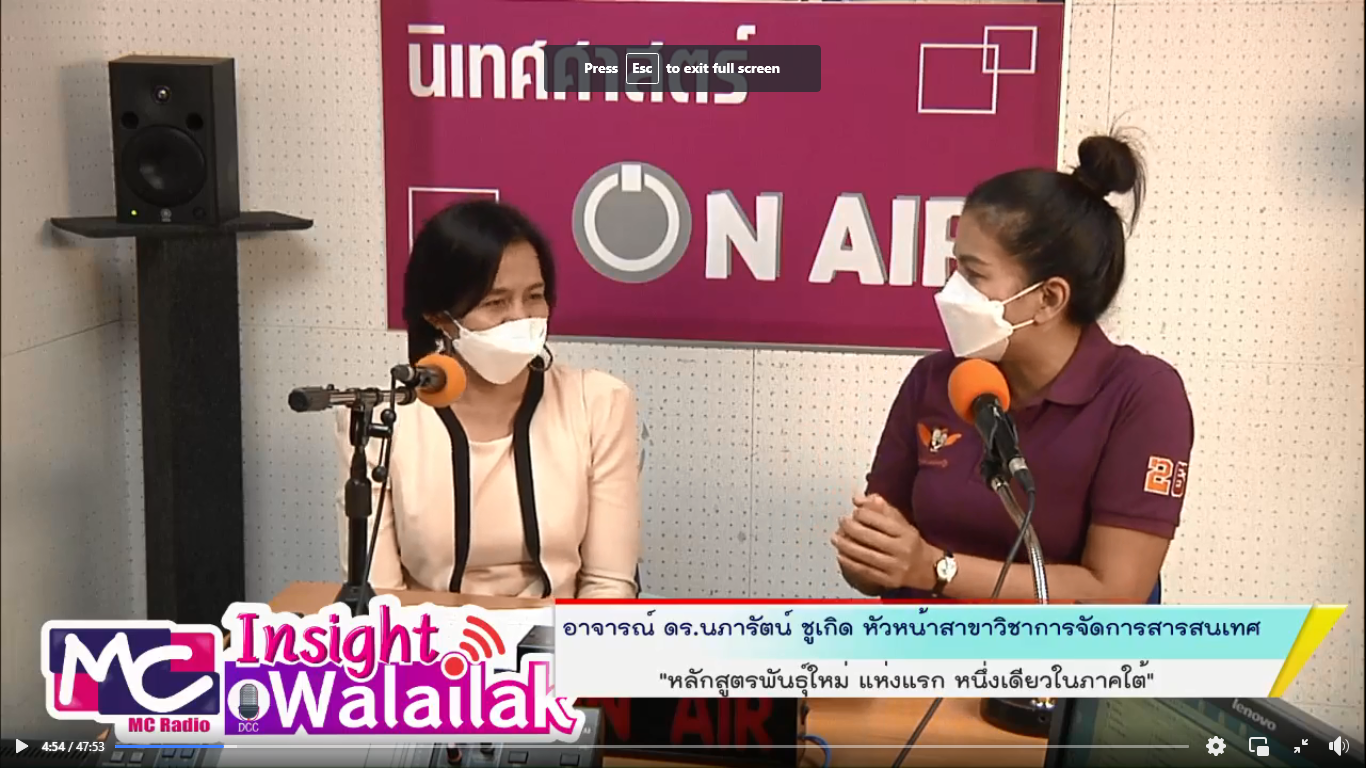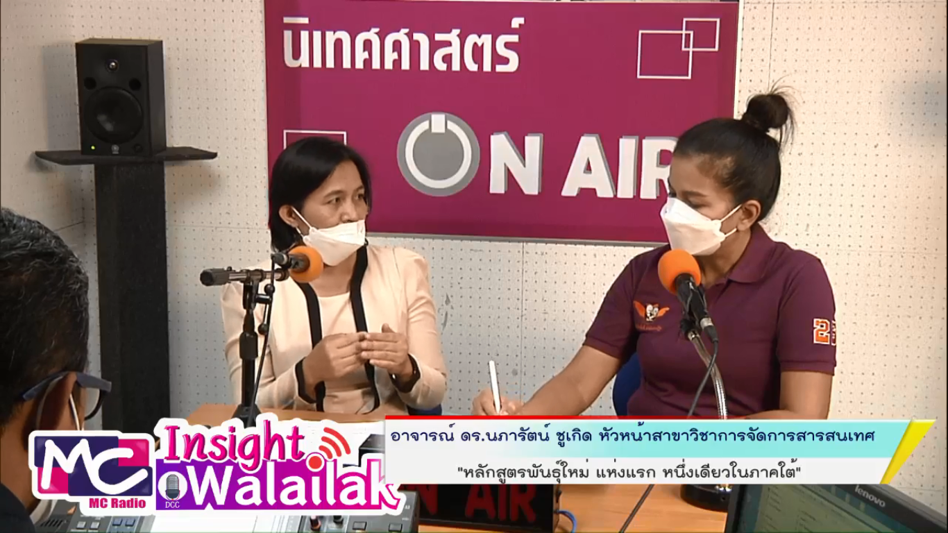 อาจารย์ ดร.นภารัตน์ ชูเกิด หัวหน้าสาขาวิชาการจัดการสารสนเทศ ร่วมพูดคุยประชาสัมพันธ์หลักสูตรดิจิทัลคอนเทนต์และสื่อ ในรายการวิทยุ MC Radio and Radio Thailand ช่วง Insight Walailak