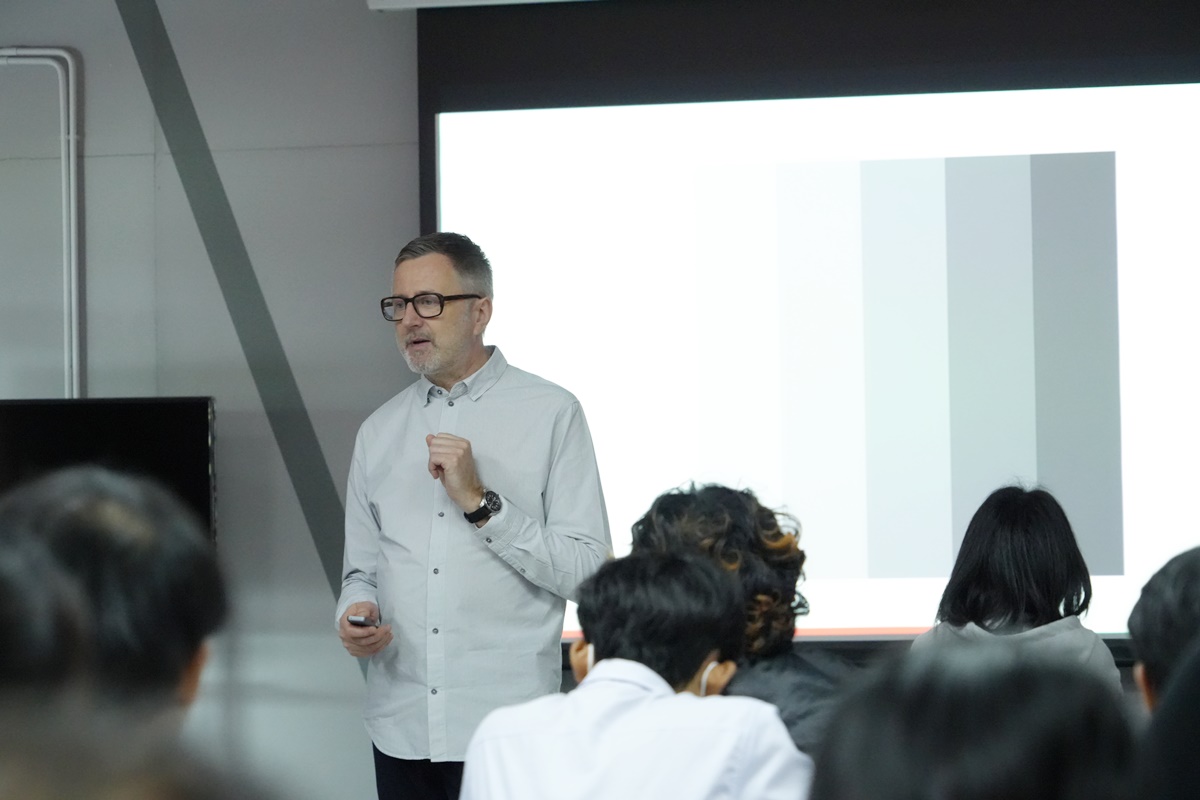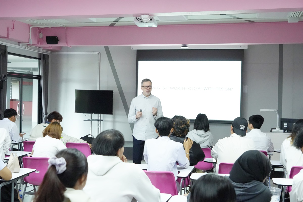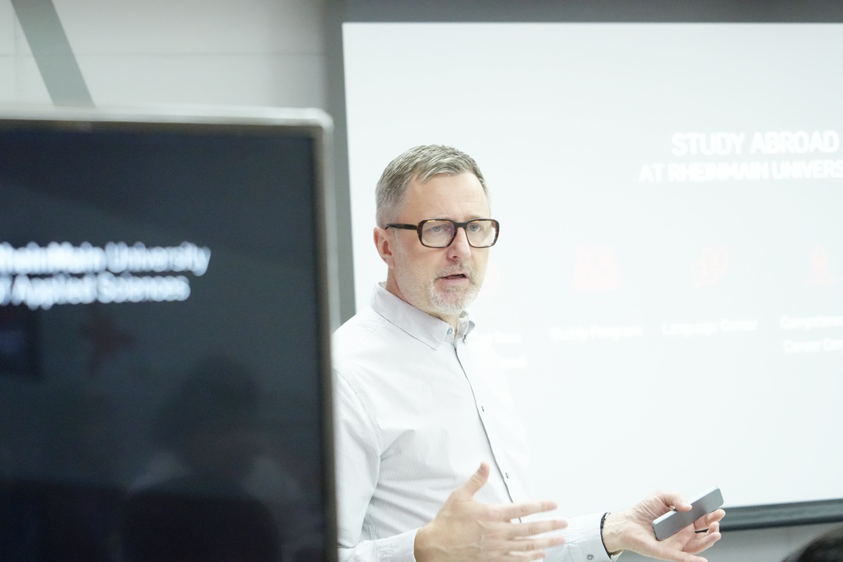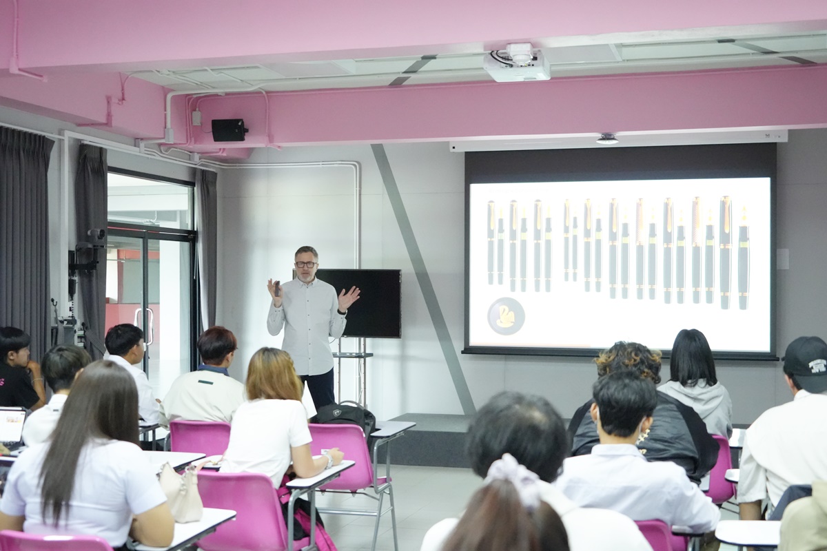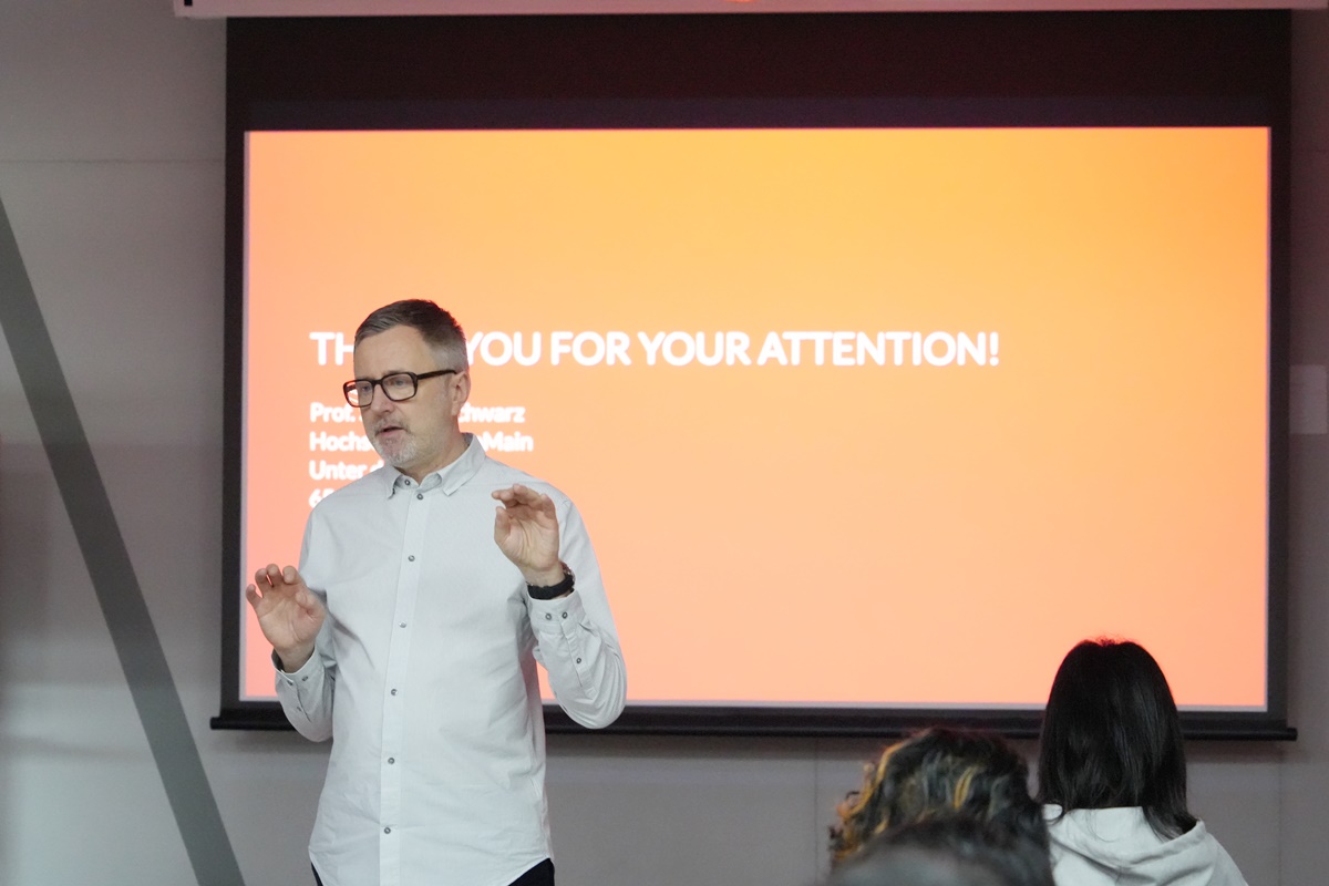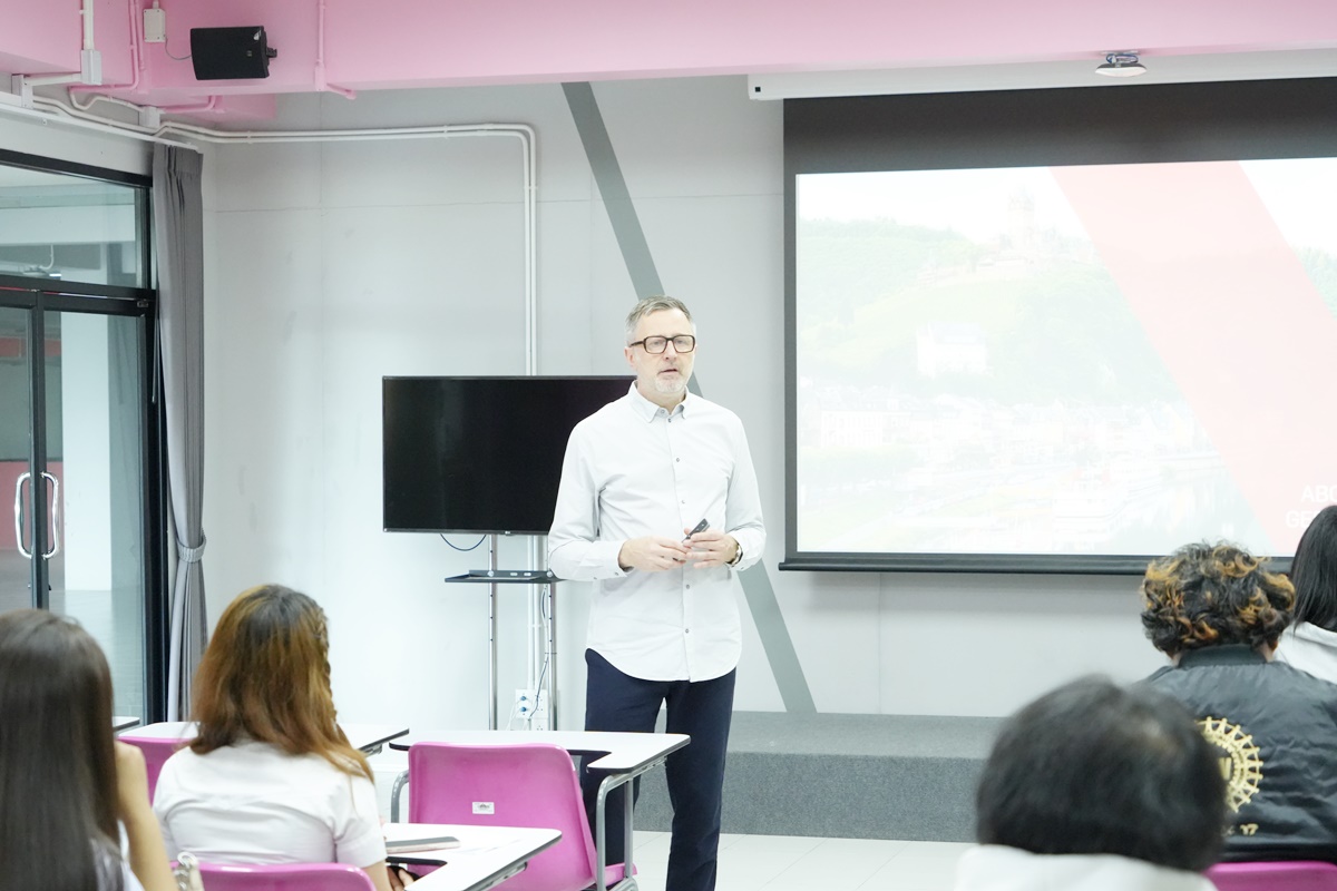 โดยในช่วงเช้า Prof. Stephan Schwarz ได้บรรยายให้ความรู้กับนักศึกษาชั้นปี 3 หลักสูตรนิเทศศาสตร์ดิจิทัลในหัวข้อ “Media Conception and Production” รวมทั้งให้ข้อมูลสำหรับการศึกษาต่อและแนวทางในการแลกเปลี่ยนนักศึกษาหรือการศึกษาหลักสูตรระยะสั้น (International short course) ที่ประเทศเยอรมัน