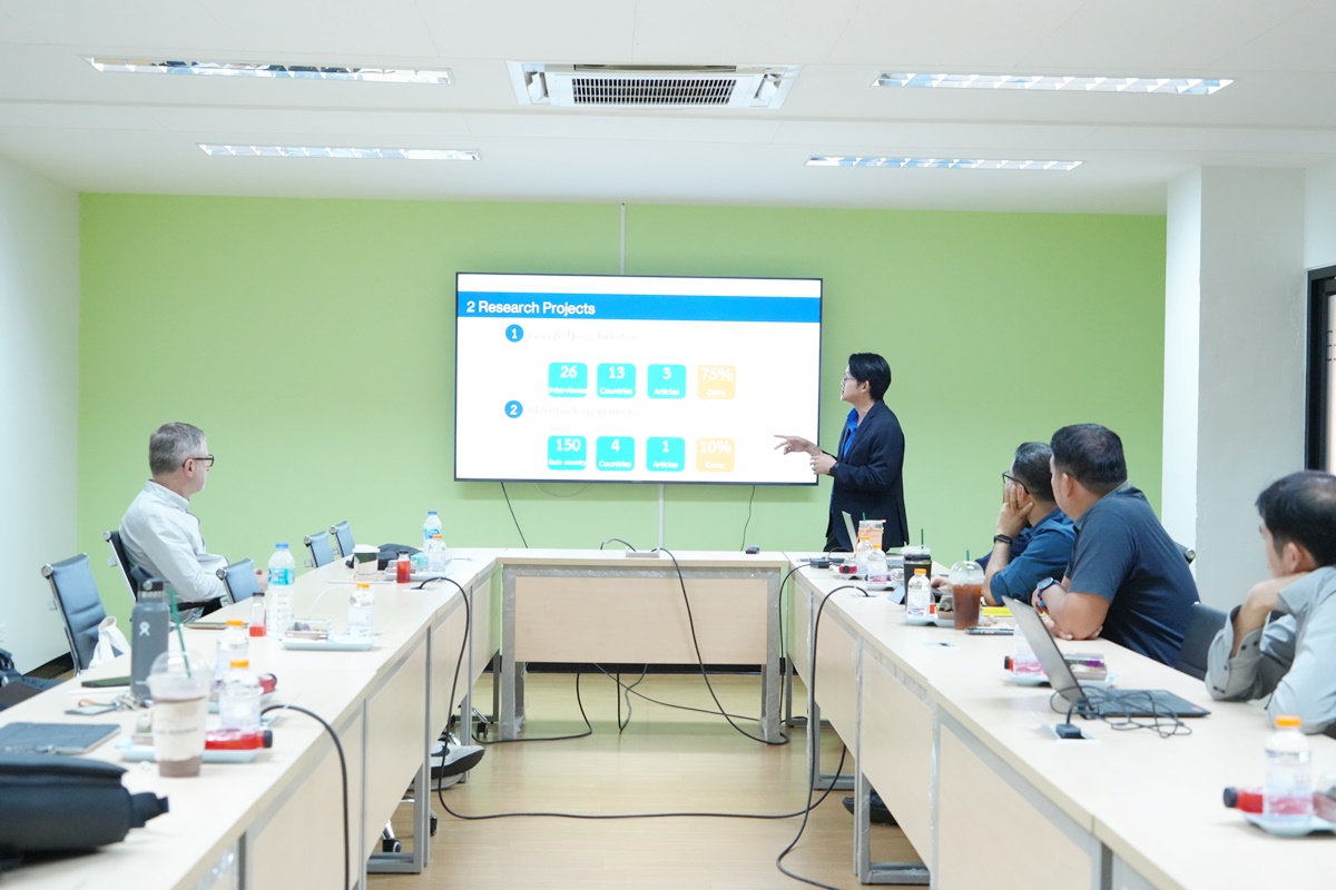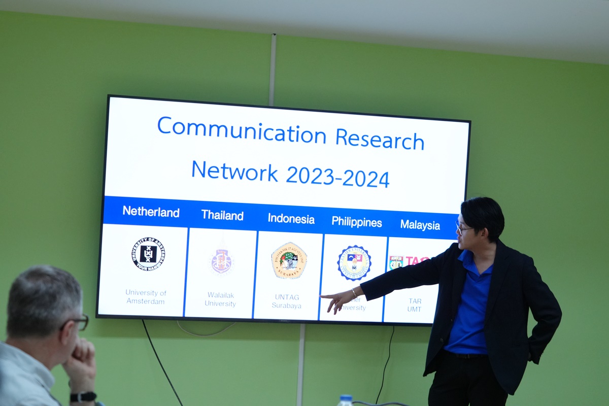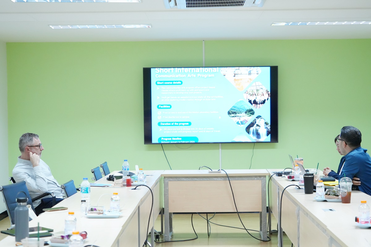 จากนั้นในช่วงบ่าย Prof. Stephan Schwarz และคณาจารย์ในสำนักวิชาสารสนเทศศาสตร์ ได้ร่วมพูดคุยหารือในประเด็นโอกาสและการสร้างความร่วมมือระหว่างกัน โดยช่วงแรก อาจารย์ ดร. อัตนันท์ เตโชพิศาลวงศ์ ตัวแทนจากอาจารย์หลักสูตรนิเทศศาสตร์ดิจิทัล ได้นำเสนอความร่วมมือระดับนานาชาติที่ทางหลักสูตรฯ ได้พัฒนาขึ้นระหว่างมหาวิทยาลัยจาก 5 ประเทศได้แก่ ประเทศเนเธอร์แลนด์ อินโดนีเซีย มาเลเซีย ญี่ปุ่นและไทย จากนั้นได้ร่วมอภิปรายแลกเปลี่ยนและนำเสนอข้อมูลความเป็นไปได้ในการพัฒนาความร่วมมือด้านการวิจัย การแลกเปลี่ยนนักศึกษาทั้ง Inbound และ Outbound รวมทั้งโอกาสในการพัฒนาความร่วมมืออย่างเป็นรูปธรรมมากยิ่งขึ้น
