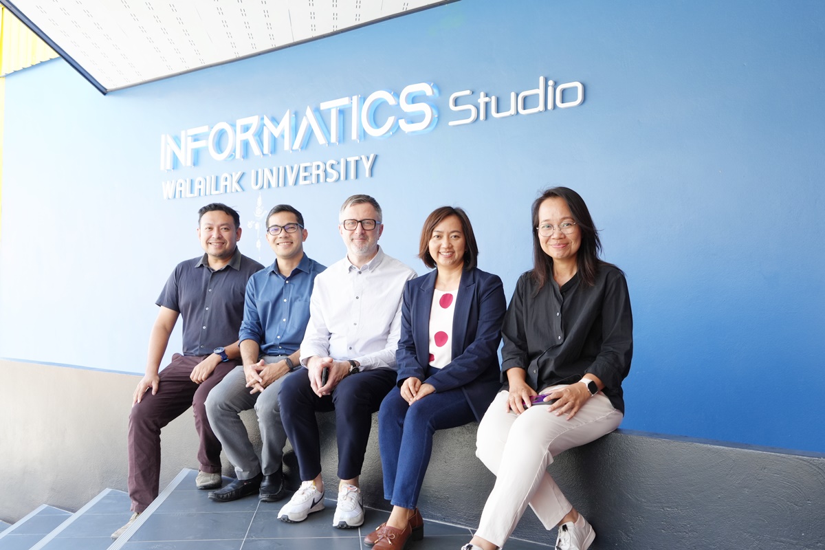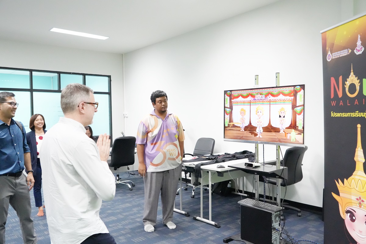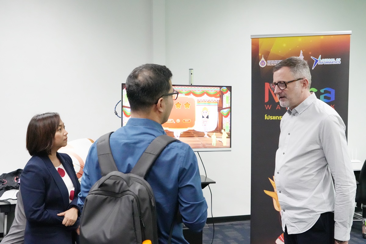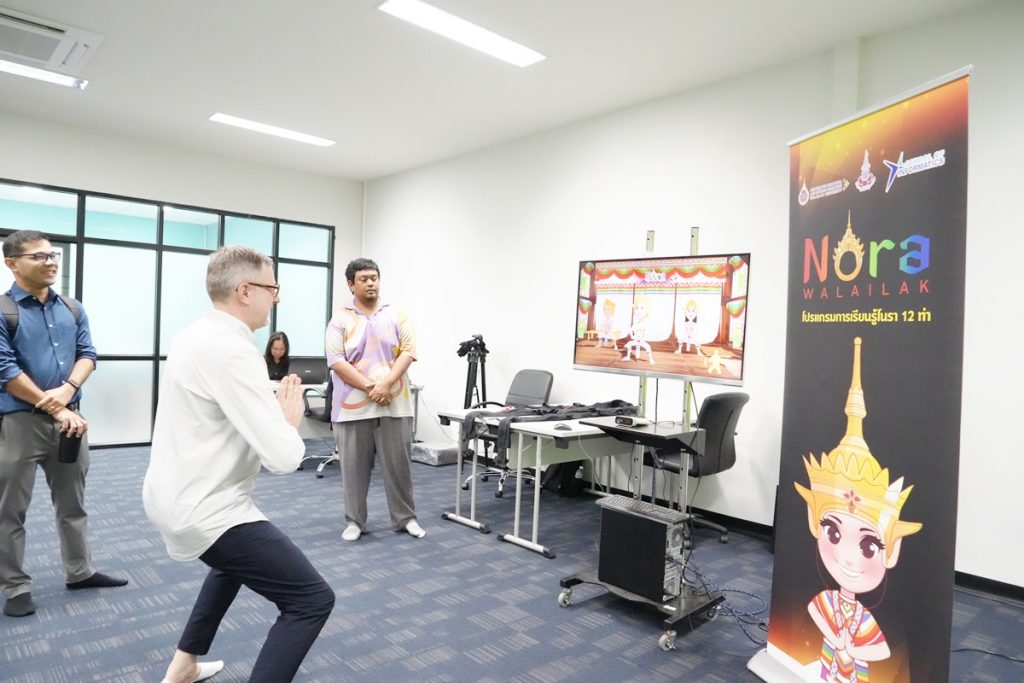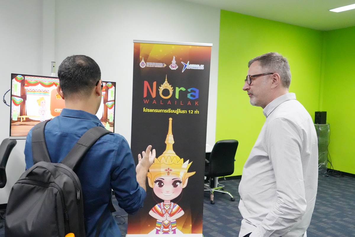 จากนั้น ได้เข้าเยี่ยมชมห้องปฏิบัติการสารสนเทศศาสตร์ (Informatics studio) อาคารสำหรับฝึกปฎิบัติการหลังใหม่ของนักศึกษาในสำนักวิชาสารสนเทศศาสตร์ ทั้ง 5 หลักสูตร โดยได้มีการสาธิตการเป็นผู้ประกาศข่าว และการสาธิตการใช้เทคโนโลยี VR/AR ในการพัฒนางานวิจัยเพื่อส่งเสริมศิลปวัฒนธรรมภาคใต้ โนรา 12 ท่า ทั้งในรูปแบบเสมือนจริง และการพัฒนาในรูปแบบเกมเพื่อส่งเสริมการเรียนรู้ ซึ่งได้รับความสนใจและมีการพูดคุยถึงโอกาสและการพัฒนาต่อยอดในการสร้างความร่วมมือด้านการวิจัยที่เกี่ยวข้องอีกด้วย