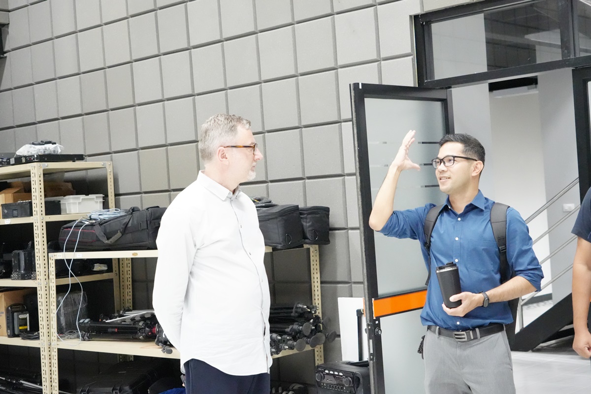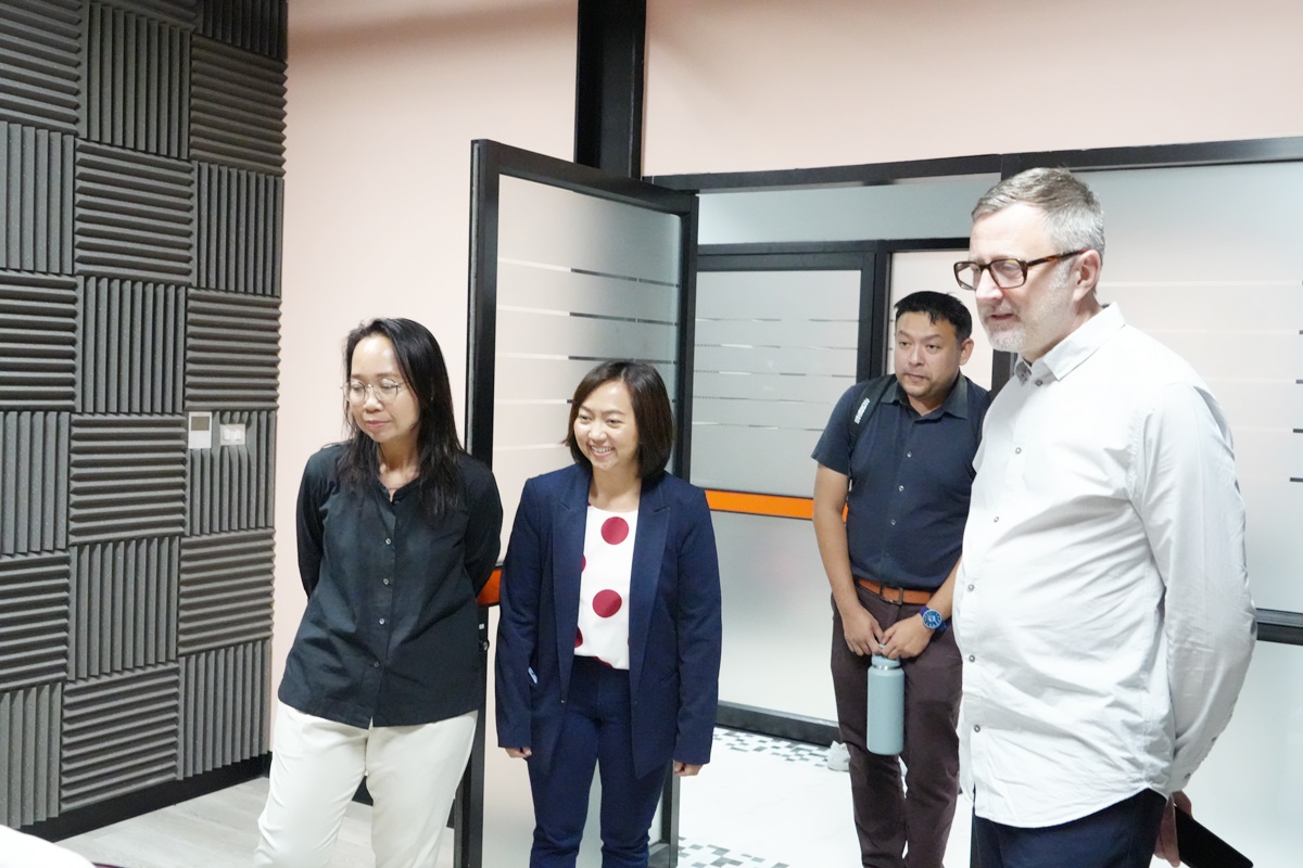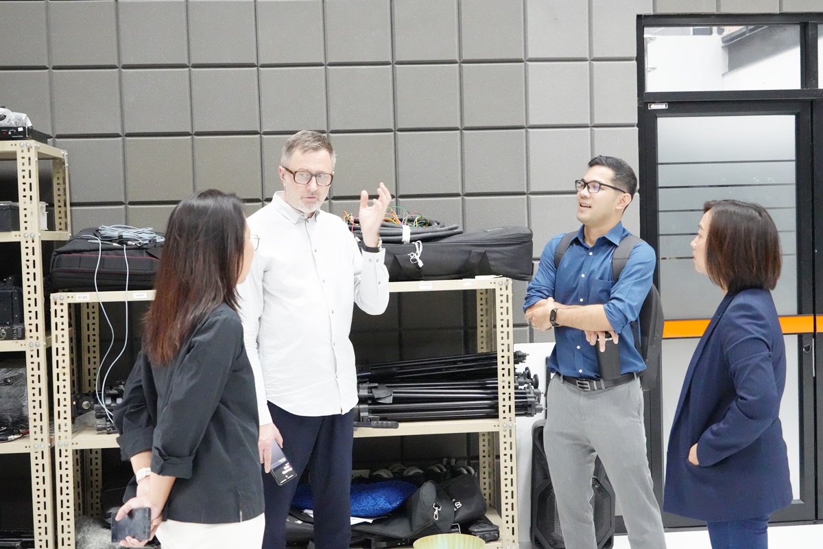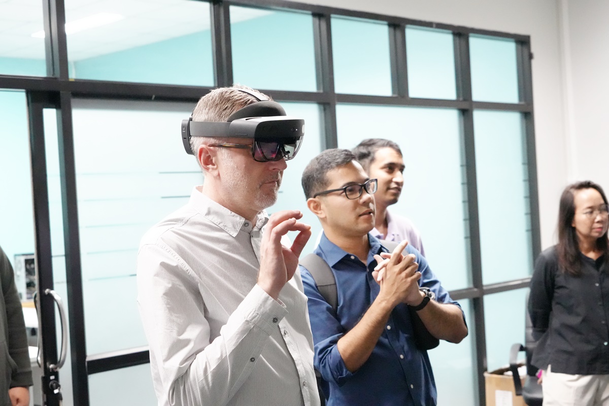 จากนั้น ได้เข้าเยี่ยมชมห้องปฏิบัติการสารสนเทศศาสตร์ (Informatics studio) อาคารสำหรับฝึกปฎิบัติการหลังใหม่ของนักศึกษาในสำนักวิชาสารสนเทศศาสตร์ ทั้ง 5 หลักสูตร โดยได้มีการสาธิตการเป็นผู้ประกาศข่าว และการสาธิตการใช้เทคโนโลยี VR/AR ในการพัฒนางานวิจัยเพื่อส่งเสริมศิลปวัฒนธรรมภาคใต้ โนรา 12 ท่า ทั้งในรูปแบบเสมือนจริง และการพัฒนาในรูปแบบเกมเพื่อส่งเสริมการเรียนรู้ ซึ่งได้รับความสนใจและมีการพูดคุยถึงโอกาสและการพัฒนาต่อยอดในการสร้างความร่วมมือด้านการวิจัยที่เกี่ยวข้องอีกด้วย