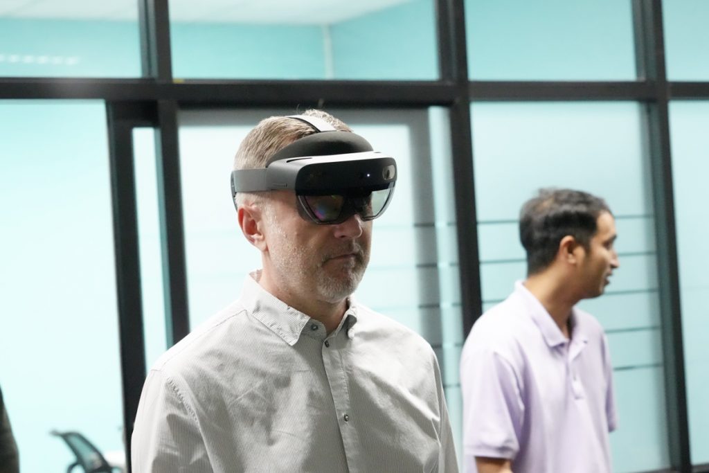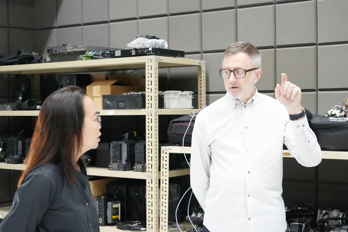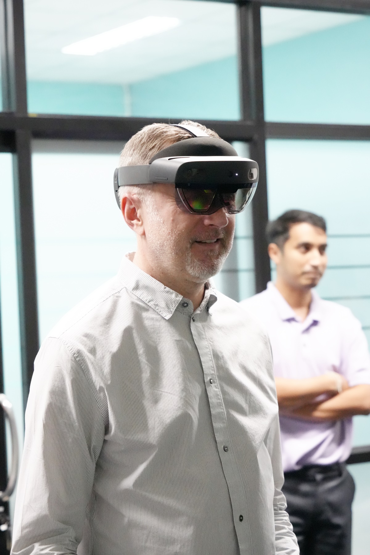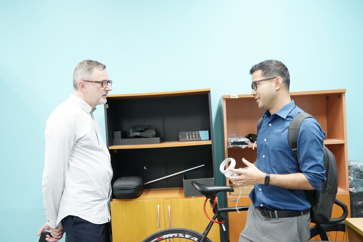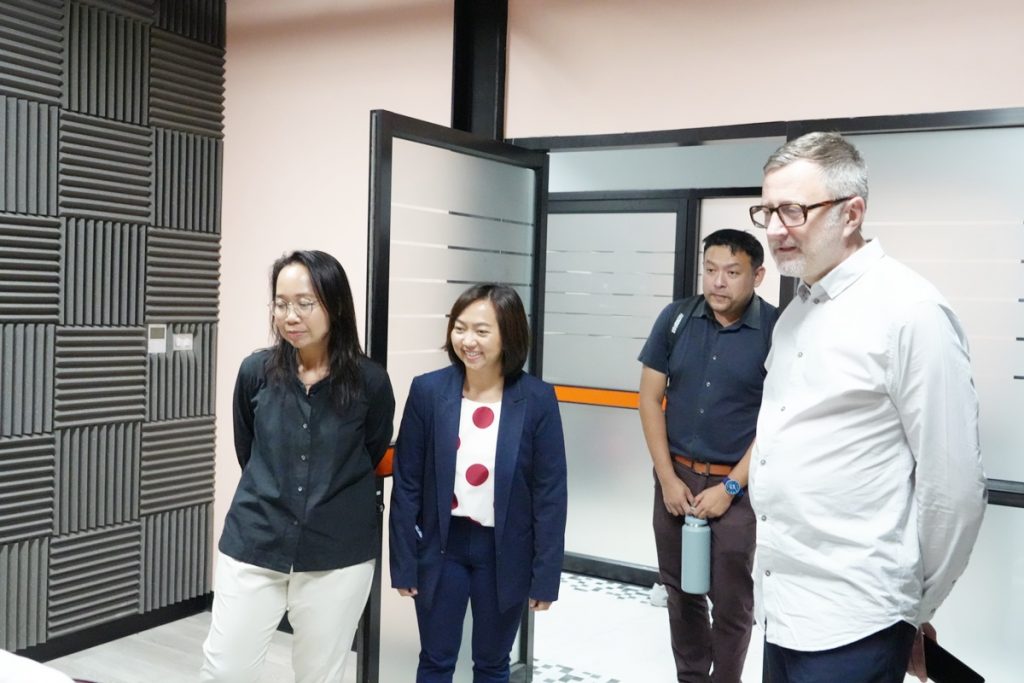 จากนั้น ได้เข้าเยี่ยมชมห้องปฏิบัติการสารสนเทศศาสตร์ (Informatics studio) อาคารสำหรับฝึกปฎิบัติการหลังใหม่ของนักศึกษาในสำนักวิชาสารสนเทศศาสตร์ ทั้ง 5 หลักสูตร โดยได้มีการสาธิตการเป็นผู้ประกาศข่าว และการสาธิตการใช้เทคโนโลยี VR/AR ในการพัฒนางานวิจัยเพื่อส่งเสริมศิลปวัฒนธรรมภาคใต้ โนรา 12 ท่า ทั้งในรูปแบบเสมือนจริง และการพัฒนาในรูปแบบเกมเพื่อส่งเสริมการเรียนรู้ ซึ่งได้รับความสนใจและมีการพูดคุยถึงโอกาสและการพัฒนาต่อยอดในการสร้างความร่วมมือด้านการวิจัยที่เกี่ยวข้องอีกด้วย