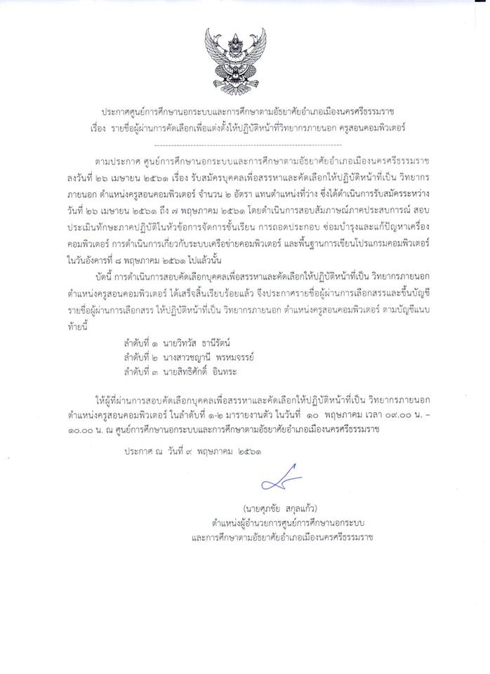 ขอแสดงความยินดีกับรุ่นพี่คนเก่งของเรา ไอที รุ่น 7 นางสาวชญานี พรหมจรรย์ นักศึกษาหลักสูตรเทคโนโลยีสารสนเทศ สำนักวิชาสารสนเทศศาสตร์ ที่ได้เข้ารับตำแหน่งครูสอนคอมพิวเตอร์ จากประกาศของ กศน. อำเภอเมืองนครศรีธรรมราช