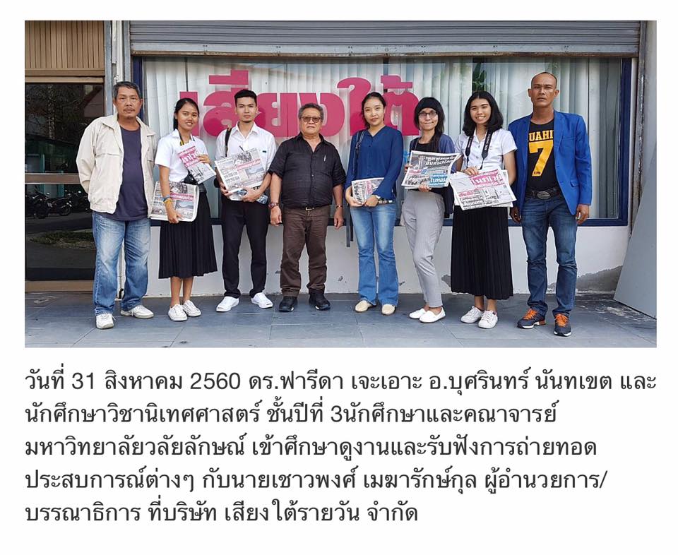 นักศึกษานิเทศศาสตร์ มหาวิทยาลัยวลัยลักษณ์ เข้าศึกษาดูงานด้านการประชาสัมพันธ์ การสื่อสารองค์กร และด้านวารสารศาสตร์