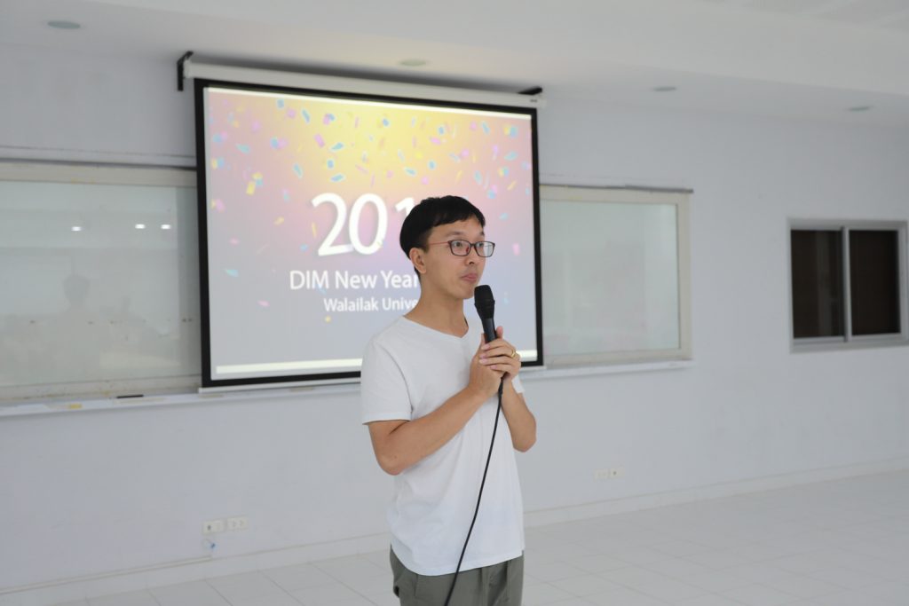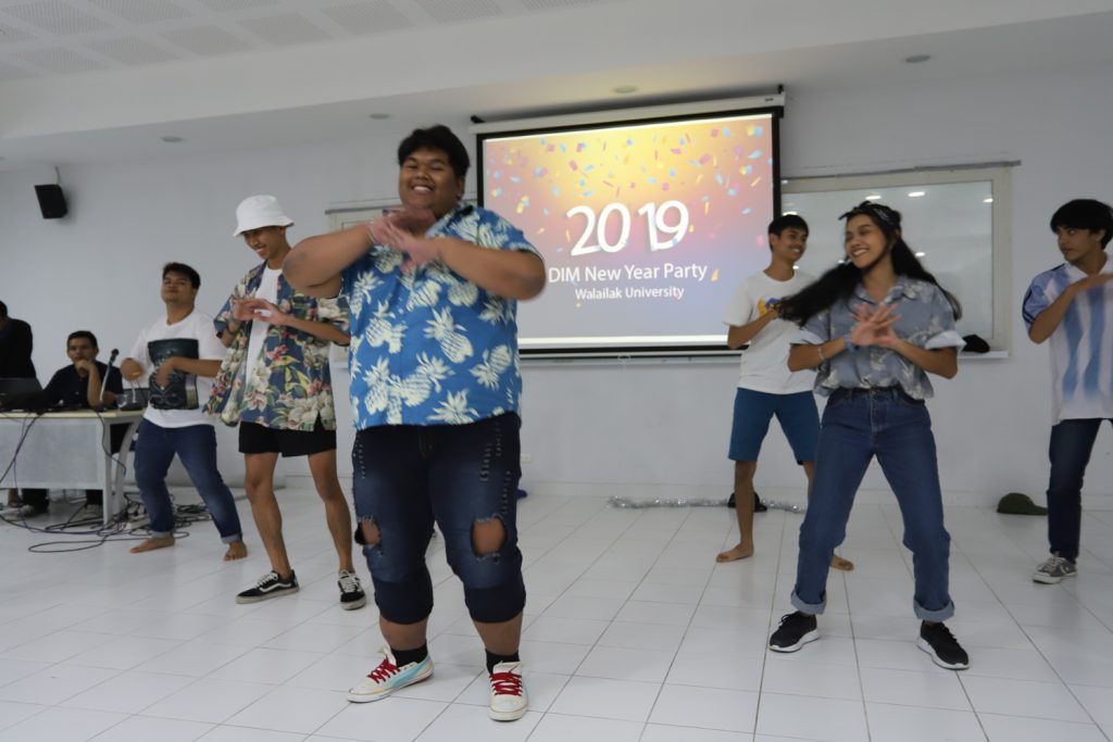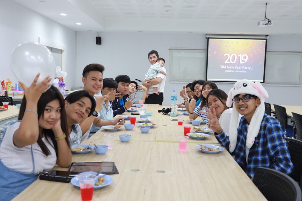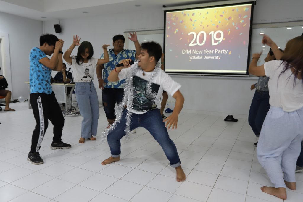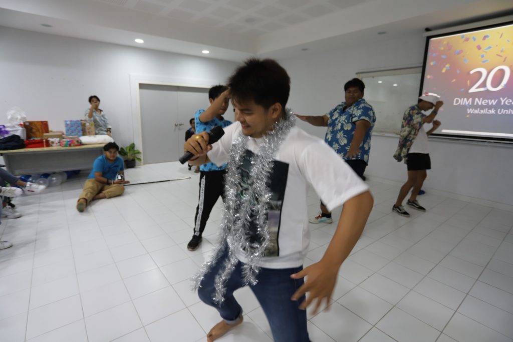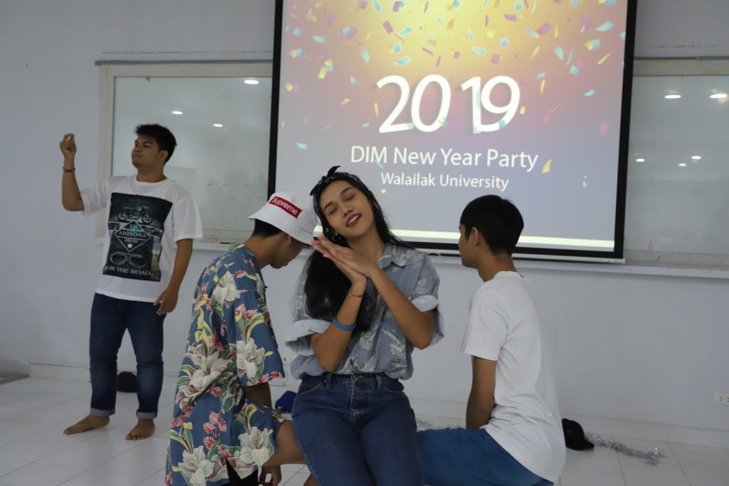 คณาจารย์ DIM จัดกิจกรรมแลกของขวัญปีใหม่ร่วมกับนักศึกษา พร้อมกับจัดงานปาร์ตี้สบายๆ บรรยากาศสนุกสนานและอบอุ่นกันในแบบพี่น้องและครอบครัว งานนี้มีการแสดงของนักศึกษาทุกชั้นปี และการแสดงชุดพิเศษจากคณาจารย์ที่ได้รับเสียงกรี๊ดดังที่สุดและสร้างความประทับให้กับนักศึกษาในหลักสูตรเป็นอย่างมาก และที่ขาดไม่ได้เลยสำหรับปาร์ตี้ชาว DIM ของเราคือ ท่านอาจารย์ ผศ.ดร.ศิวนาถ นันทพิชัย หรือ อ.ตุ๋ย ของพวกเรา ได้โชว์ฝีมือเชฟมือทองกับเมนู ขนมจีนน้ำเงี้ยวและแกงเขียวหวานไก่ให้พวกเราได้อร่อยกันในทุกๆ งาน จนเป็นที่พูดกันติดปากว่า “เรียน DIM ต้องได้กินขนมจีนน้ำเงี้ยวและแกงเขียวหวานไก่ อ.ตุ๋ย ถึงจะเรียกว่าเป็นนศ. DIM อย่างเต็มตัว” ฮ่าๆ นอกจากนี้ อ.ยุทธนา หรือ อ.ต๊ะ กับพี่ผึ้ง ก็สนับสนุนโดยการทำลูกชิ้นหม่าลามาอีก 1 ถาด รสชาติแซ่บถึงใจจริงๆ เลยครับ ว่าแล้วแอดมินก็อยากกินอีก เมื่อคืนแย่งปี 1 ไม่ทัน 55555+