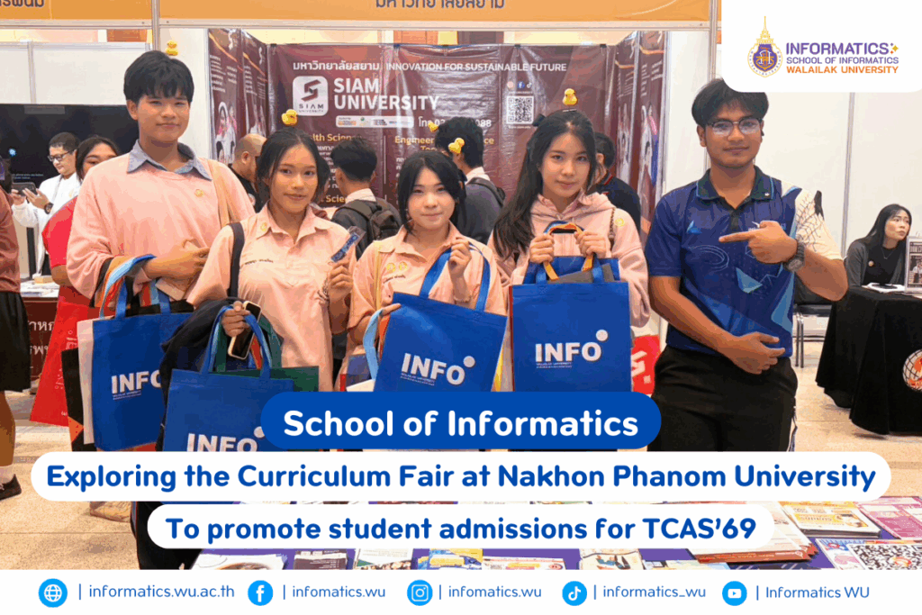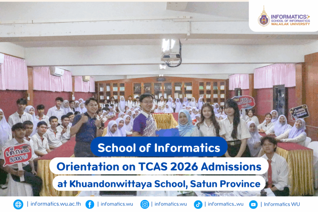 On Wednesday, August 5, 2025, the School of Informatics, Walailak University, organized a guidance activity for further education through the TCAS’69 system at Thung Wao Worawit School, Satun Province. The delegation consisted of academic officers, public relations staff, student admissions officers, and student representatives from the School, who traveled to provide information and inspire local high school students.
