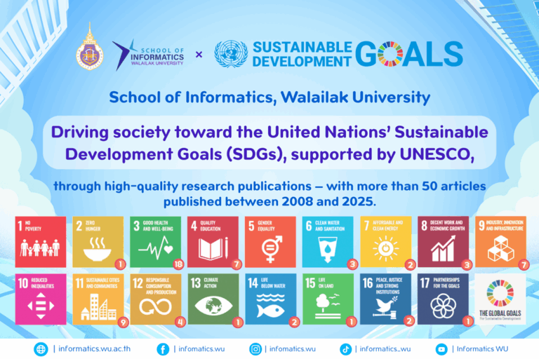 The School of Informatics, Walailak University, remains committed to producing research that addresses societal and environmental challenges. The School actively supports the United Nations Sustainable Development Goals (UNESCO’s SDGs) through more than 50 research publications between 2009 and 2025.