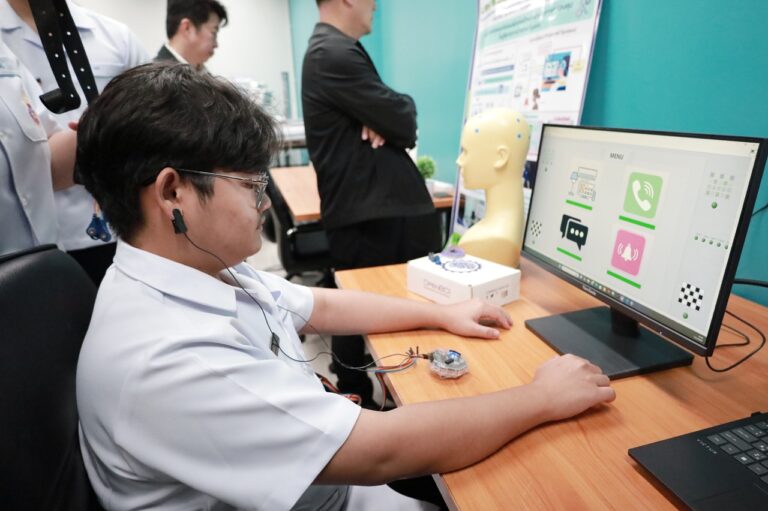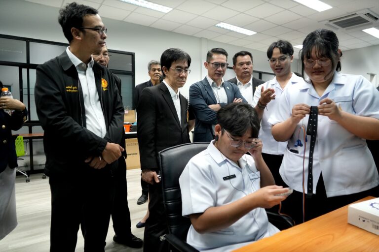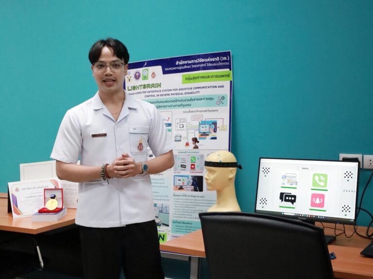 A major highlight was the student project “LIGHTBRAIN”, a Brain-Computer Interface (BCI) for communication and control for individuals with severe physical disabilities. Developed by 3rd-year students in the Digital Technology in Medicine program, it won the Gold Medal at the Thailand New Gen Inventors Award 2026 (I-New Gen Award 2026).