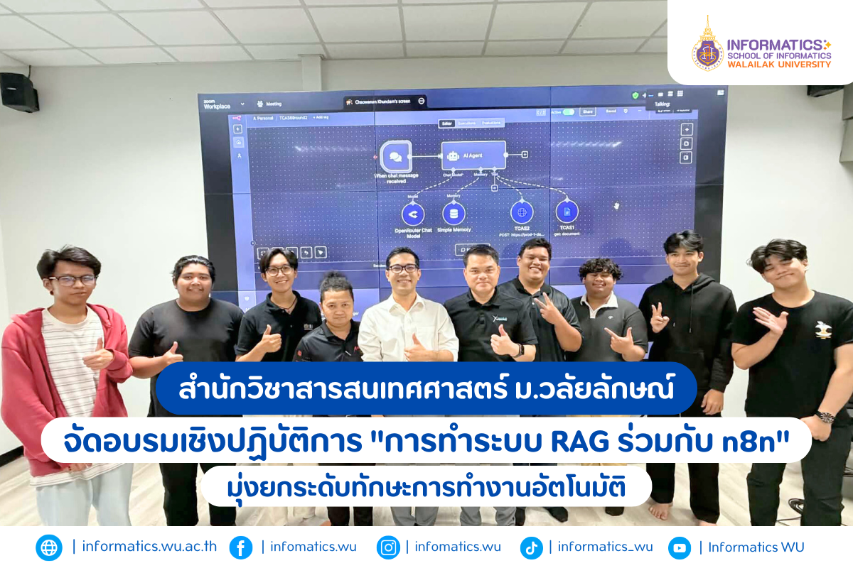 เมื่อวันจันทร์ที่ 9 มีนาคม 2569 เวลา 09.00 – 16.00 น. ที่ผ่านมา สำนักวิชาสารสนเทศศาสตร์ มหาวิทยาลัยวลัยลักษณ์ จัดกิจกรรมอบรมเชิงปฏิบัติการ (Workshop) ในหัวข้อ “การทำระบบ RAG กับ n8n” ณ ห้องปฏิบัติการ BI (BI Lab) อาคารปฏิบัติการสารสนเทศศาสตร์ เพื่อติดอาวุธทางเทคโนโลยีและเสริมสร้างทักษะการทำงานในยุคดิจิทัล