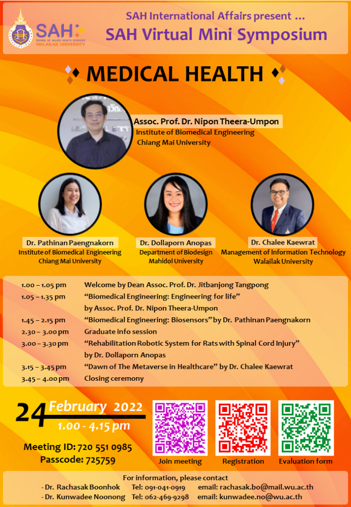 เมื่อวันที่ 24 กุมภาพันธ์ 2565 อ.ดร.ชาลี แก้วรัตน์ อาจารย์ประจำหลักสูตรนวัตกรรมสารสนเทศทางการแพทย์ สำนักวิชาสารสนเทศศาสตร์ เข้าร่วมเสวนาเรื่อง Dawn of the Metaverse in Healthcare ภายใต้หัวข้อ MEDICAL HEALTH