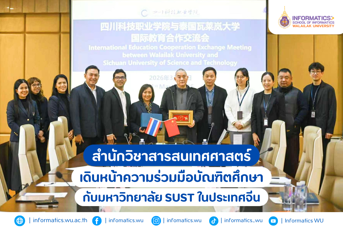 เมื่อวันที่ 31 มีนาคม 2569 ผู้ช่วยศาสตราจารย์ ดร.สิริวัจนา แก้วผนึก คณบดีสำนักวิชาสารสนเทศศาสตร์ มหาวิทยาลัยวลัยลักษณ์ พร้อมด้วยคณะผู้บริหารและคณาจารย์ของสำนักวิชาฯ และ อาจารย์ ดร.ดารุณี บุญครอง ผู้ช่วยคณบดีฝ่ายยุทธศาสตร์จีนด้านบัณฑิตศึกษาและความร่วมมือทางการศึกษาบัณฑิตวิทยาลัย ได้เข้าหารือความร่วมมือทางวิชาการร่วมกับ Sichuan University of Science and Technology (SUST) ณ สาธารณรัฐประชาชนจีน